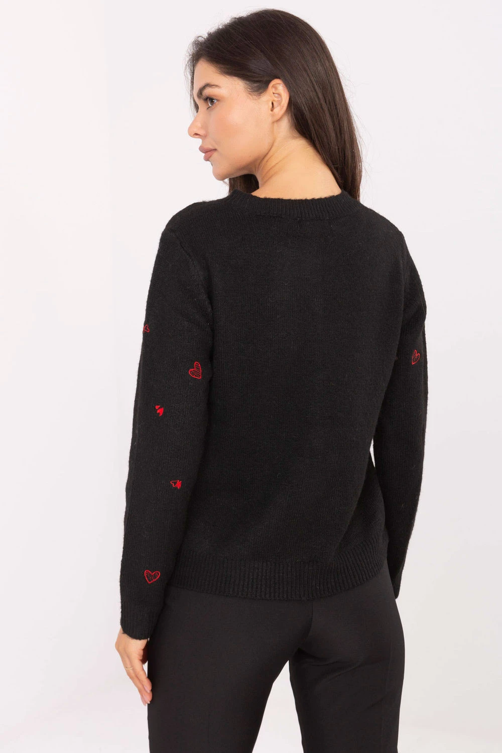 Půvabný dámský svetr s ležérním charakterem, ideální pro každodenní stylizace. Vyrobena z příjemné směsi polyesteru, akrylu a vlny, která poskytuje teplo a pohodlí při nošení. Model má standardní délku, dlouhý rukáv a okrouhlý výstřih, jeho přední část a rukávy zdobí vyšívaná srdíčka, která dodávají celku dívčí půvab. Zapínání na knoflíky zdůrazňuje klasický střih a dělá svetr skvěle padnoucí jak s džínami, tak s sukní.