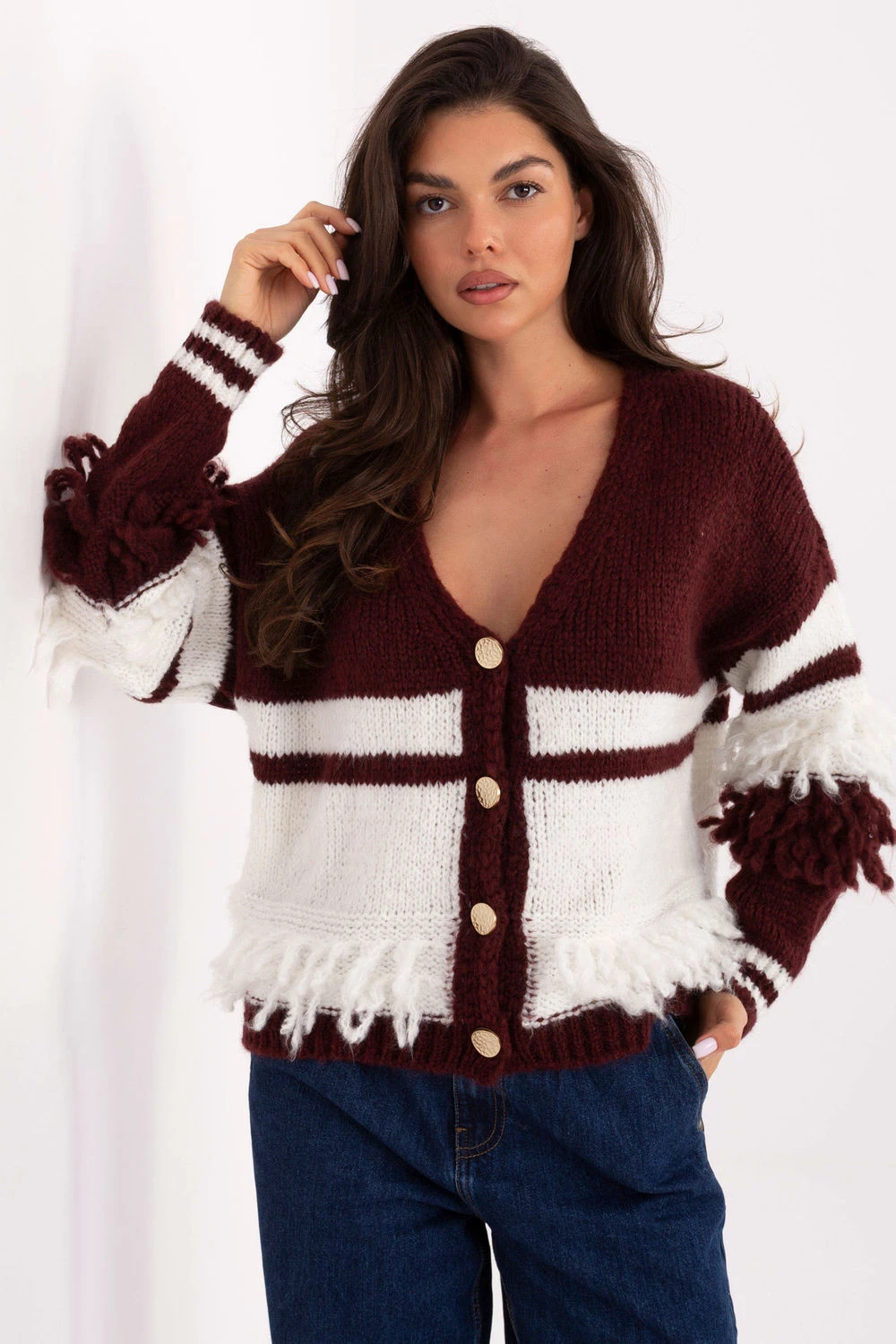 Dvoubarevný dámský svetr je módním prvkem šatníku v casual stylu, ideální na každodenní nošení a různé příležitosti. Vyrobený z kombinace polyakrylu, polyamidu, vlny a viskózy, poskytuje teplo, pohodlí a potěšení z nošení. Výstřih do V a zapínání ozdobnými knoflíky mu dodávají elegantní charakter. Dlouhý rukáv a standardní délka zaručují pohodlí při nošení. Franže vpředu a na rukávech přinášejí originální, lehce bohémský akcent, dodávajíci svetru výjimečný styl. Jedná se o svetr, který spojuje pohodlí, funkčnost a módní design, ideální pro casual a stylové kombinace.