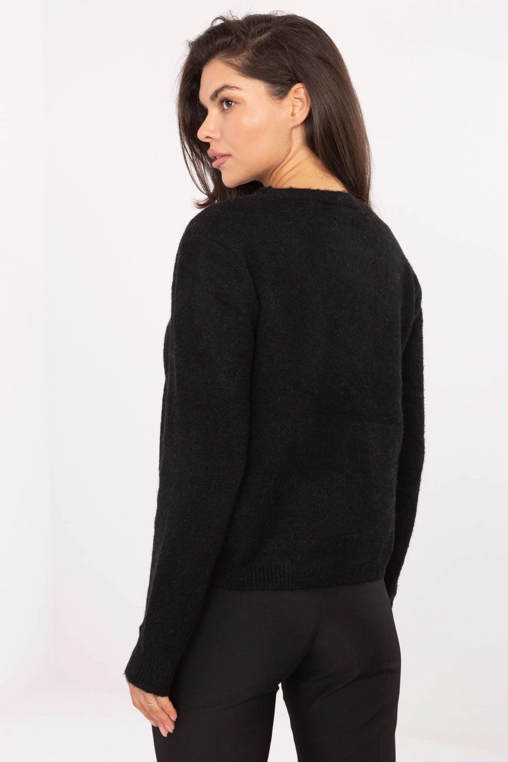 Elegantní a zároveň casual dámský svetr standardní délky, který se skvěle hodí jak do každodenního nošení, tak i do práce. Vyrobený z kombinace polyesteru, vlny a akrylu, poskytuje pohodlí, měkkost a odolnost. Model vyniká hladkým vzorem a decentním lemováním z krajky, jemné ozdoby se objevují u výstřihu do V a na spodku svetra, dodávají celku ženský charakter. Dlouhý rukáv a klasické zapínání na knoflíky dělají ze svetra praktický a univerzální kousek do šatníku. Ideální volba pro ženy, které oceňují spojení pohodlí a elegance v každodenních outfitech.