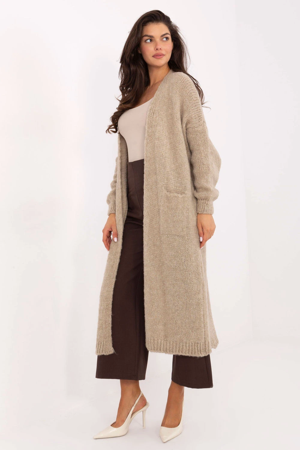 Dlouhý dámský kardigan v casual stylu, ideální na každý den i do práce. Vyrobený z měkké a příjemné směsi polyakrylu, polyamidu, vlny a viskózy, zajistí pohodlí po celý den. Bez zapínání, délka nad kolena, s dlouhými rukávy a praktickými kapsami, kombinuje eleganci s funkcionalitou. Hladká textura materiálu umožňuje snadné sladění kardiganu s různými stylizacemi, vytvářející pohodlné a stylové outfity.