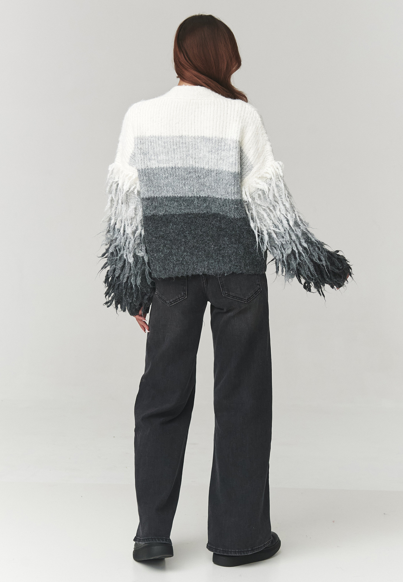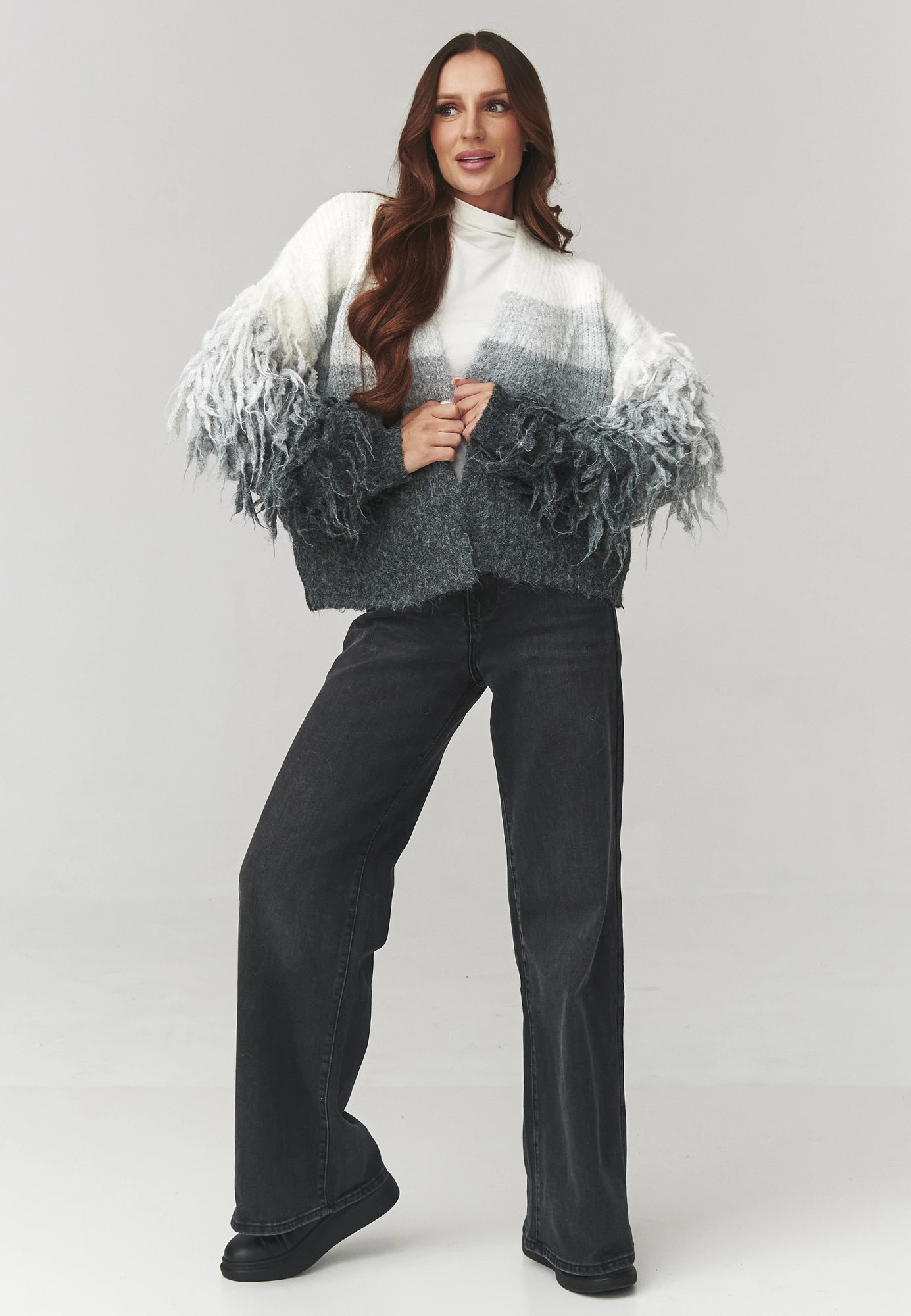 Elegantní dámský svetr ve šedé a béžové barvě je spojením pohodlí a výjimečného designu. Model vyrobený z měkké, příjemné na dotek příze poskytuje teplo a pohodlí v chladnějších dnech. Volný střih typu one size se skvěle přizpůsobuje postavě, zaručuje volnost pohybu a módní vzhled. Rukávy zdobené efektními řasami dodávají svetru originální charakter, a jemný přechod barev od světlejšího po tmavší vytváří elegantní, moderní efekt ombre. Ideální k džínám, legínám nebo sukním, skvěle se hodí jak na každý den, tak na setkání s přáteli.