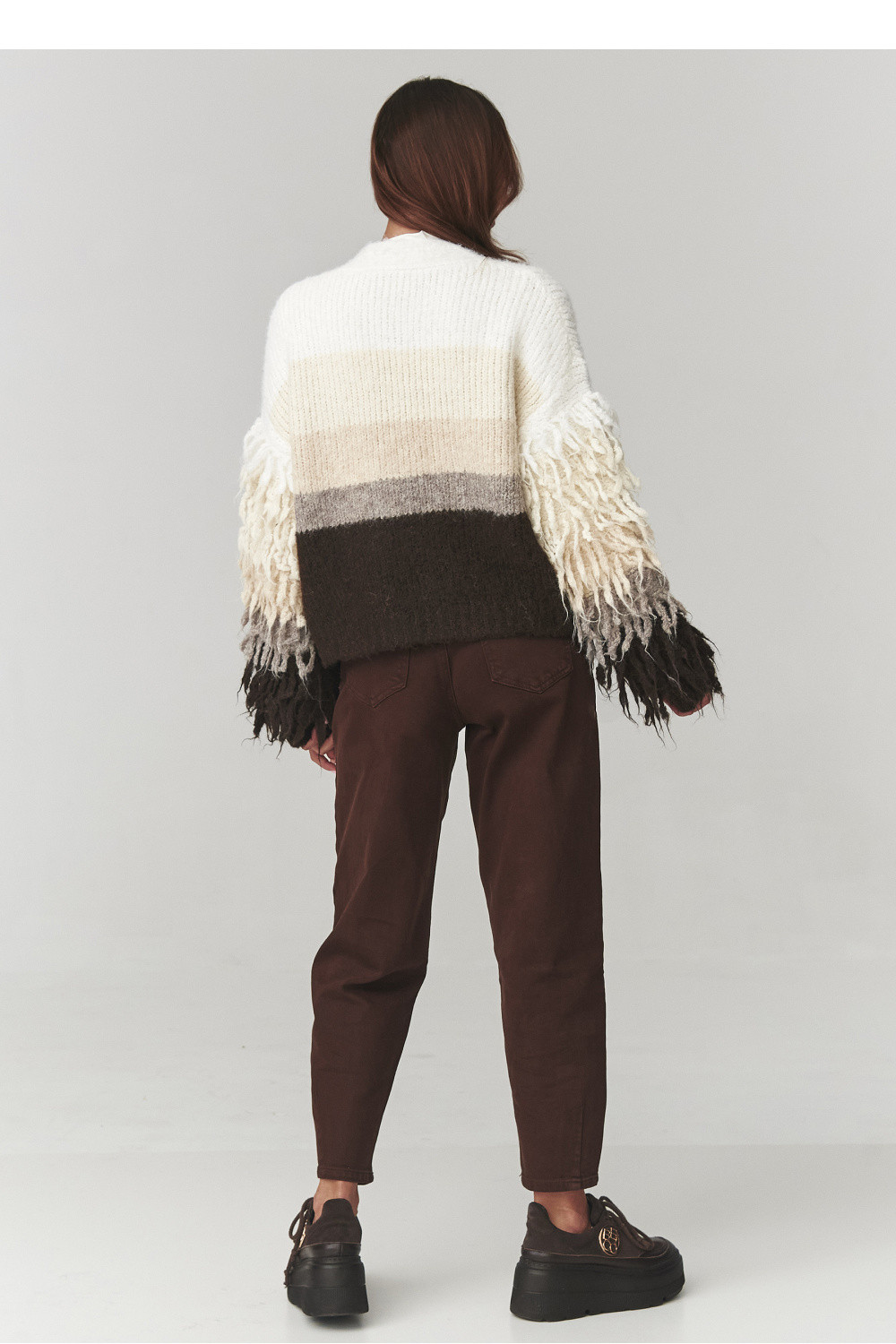 Elegantní dámský svetr v šedé a béžové barvě je kombinací pohodlí a jedinečného designu. Model vyrobený z měkké, příjemné na dotek příze poskytuje teplo a pohodlí v chladnějších dnech. Volný střih typu one size skvěle padne k postavě, zajistí volnost pohybu a módní vzhled. Rukávy zdobené efektními franžemi dodávají svetru originální charakter, a jemný přechod barev od světlejšího k tmavšímu vytváří elegantní, moderní efekt ombre. Ideální k džínům, legínám nebo sukním, skvěle se hodí jak na každý den, tak na setkání s přáteli.