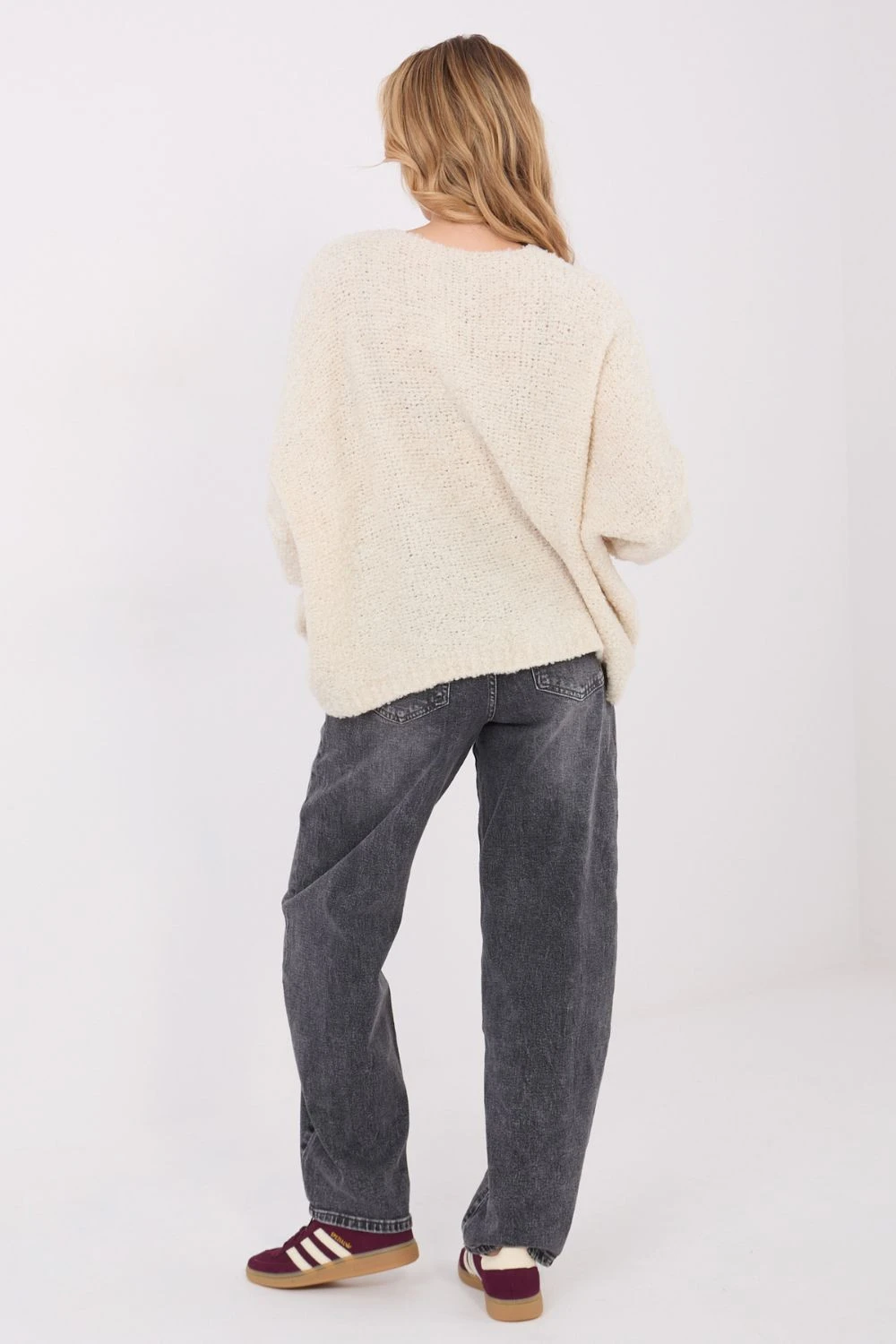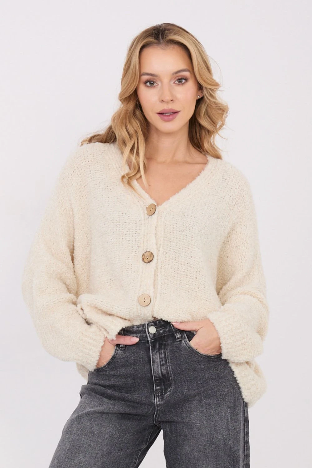 Tento volný dámský svetr je stylový a zároveň pohodlná volba ideální na každý den i do práce. Vyrobený z směsi akrylu, viskózy, vlny a polyamidu, poskytuje měkkost, teplo a příjemný pocit při nošení. Hladká struktura materiálu mu dodává univerzální charakter, který lze snadno sladit s mnoha stylizacemi. Model standardní délky má dlouhý rukáv a klasický výstřih do V, který decentně zdůrazňuje linii krku. Svetr se zapíná ozdobnými knoflíky, které mu dodávají ženský, jemně elegantní vzhled. Je to ideální volba k džínům, látkovým kalhotám nebo sukni, hodí se jak do volných setů, tak do každodenního pracovního outfitu.
