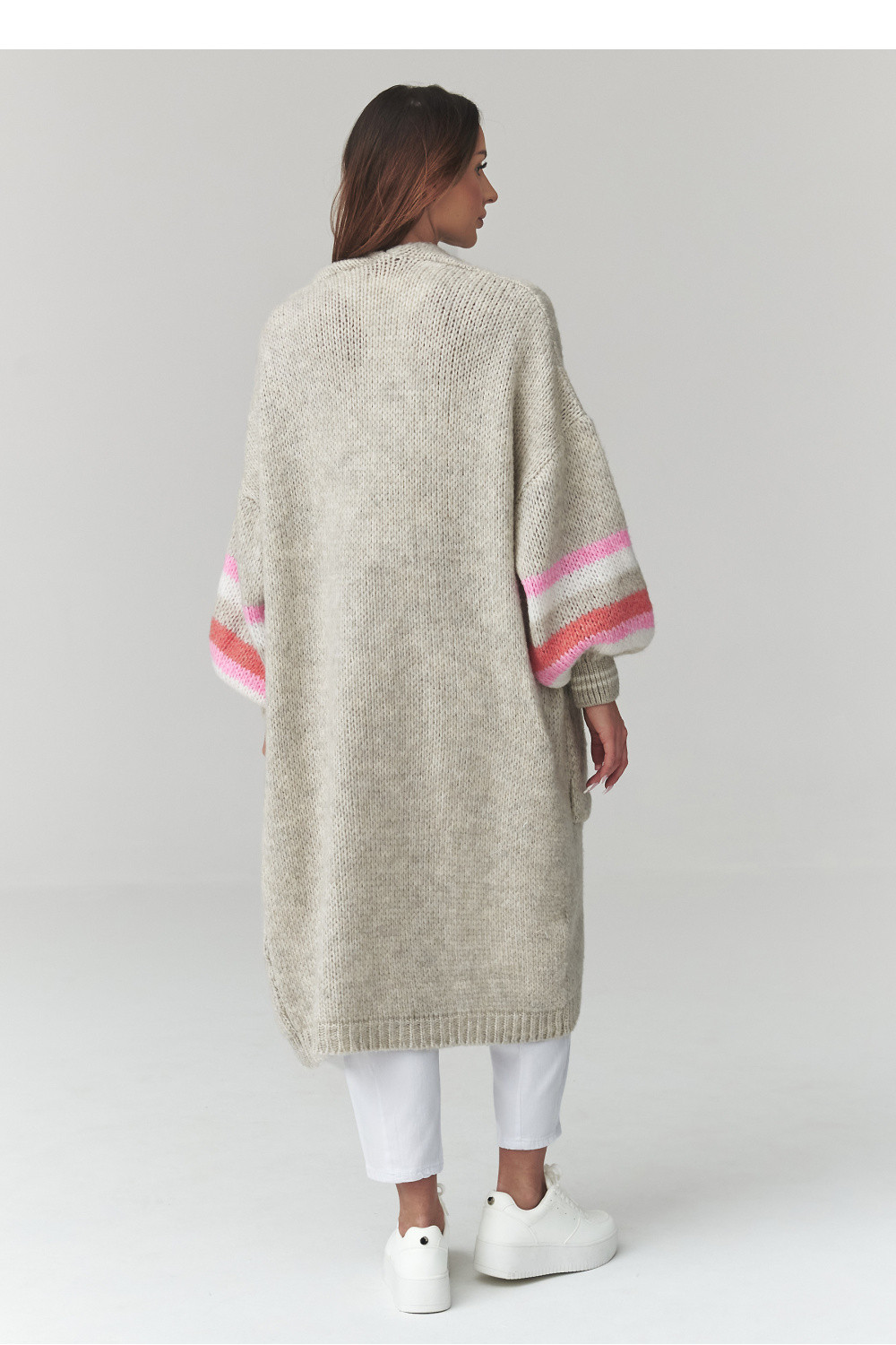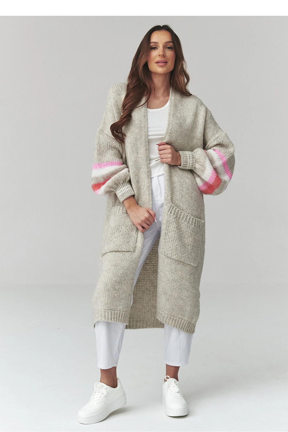 Dlouhý dámský svetr je ideální volbou pro ženy, které ocení pohodlí a styl ve svých každodenních outfitách. Model ve formě kardiganu se vyznačuje volným střihem a příjemným materiálem, díky čemuž poskytuje pohodlí po celý den. Oversize svetr skvěle padne na postavě a umožňuje vytvářet moderní vrstvené kombinace. Praktický kardigan s kapsami spojuje funkcionalitu s módním designem. Velké kapsy mu dodávají charakter a delší střih zase zajišťuje, že dlouhý dámský kardigan skvěle ladí jak s kalhotami, tak s legíny nebo šaty. Ozdobný vzor a stylové zakončení rukávů mu dodávají výjimečný vzhled. Univerzální dámský svetr na každý den se hodí do mnoha outfitů, od každodenního až po elegantní.