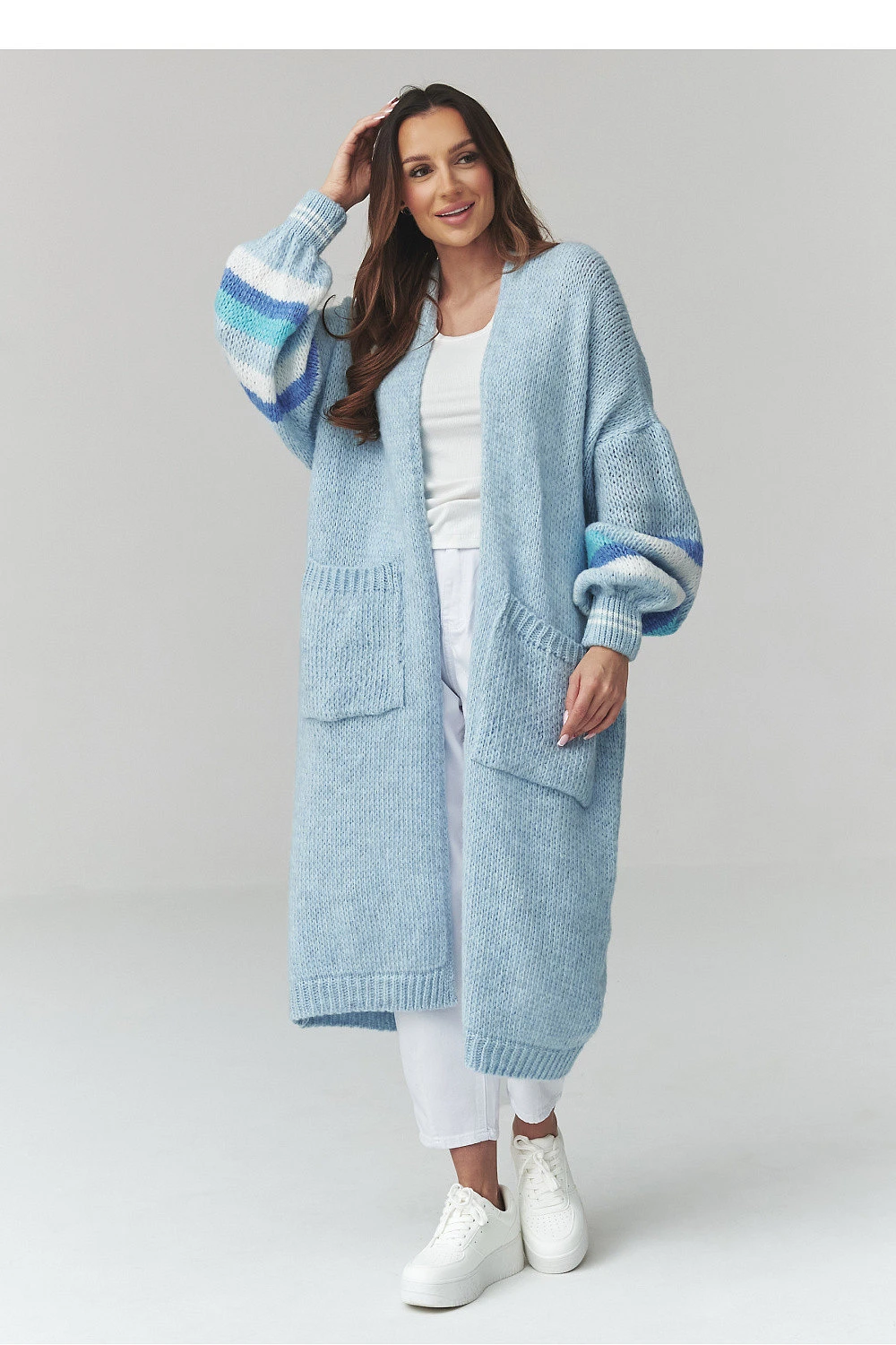 Dlouhý dámský svetr je ideální volbou pro ženy, které ocení pohodlí a styl při každodenních outfitů. Model ve formě dámského kardiganu se vyznačuje volným střihem a příjemným dotykem pleteniny, díky čemuž poskytuje pohodlí po celý den. Oversize svetr skvěle padne na postavě a umožňuje vytvářet módní, vrstvené kombinace. Praktický kardigan s kapsami kombinuje funkčnost s moderním designem. Velké kapsy mu dodávají charakter a delší střih zase zajišťuje, že dlouhý dámský kardigan se skvěle hodí jak k nohavicím, tak k legínám nebo šatům. Ozdobný vzor a stylové zakončení rukávů mu dodávají výjimečný vzhled. Univerzální dámský svetr na každý den se osvědčí v mnoha outfitových kombinacích, od casual po více elegantní.