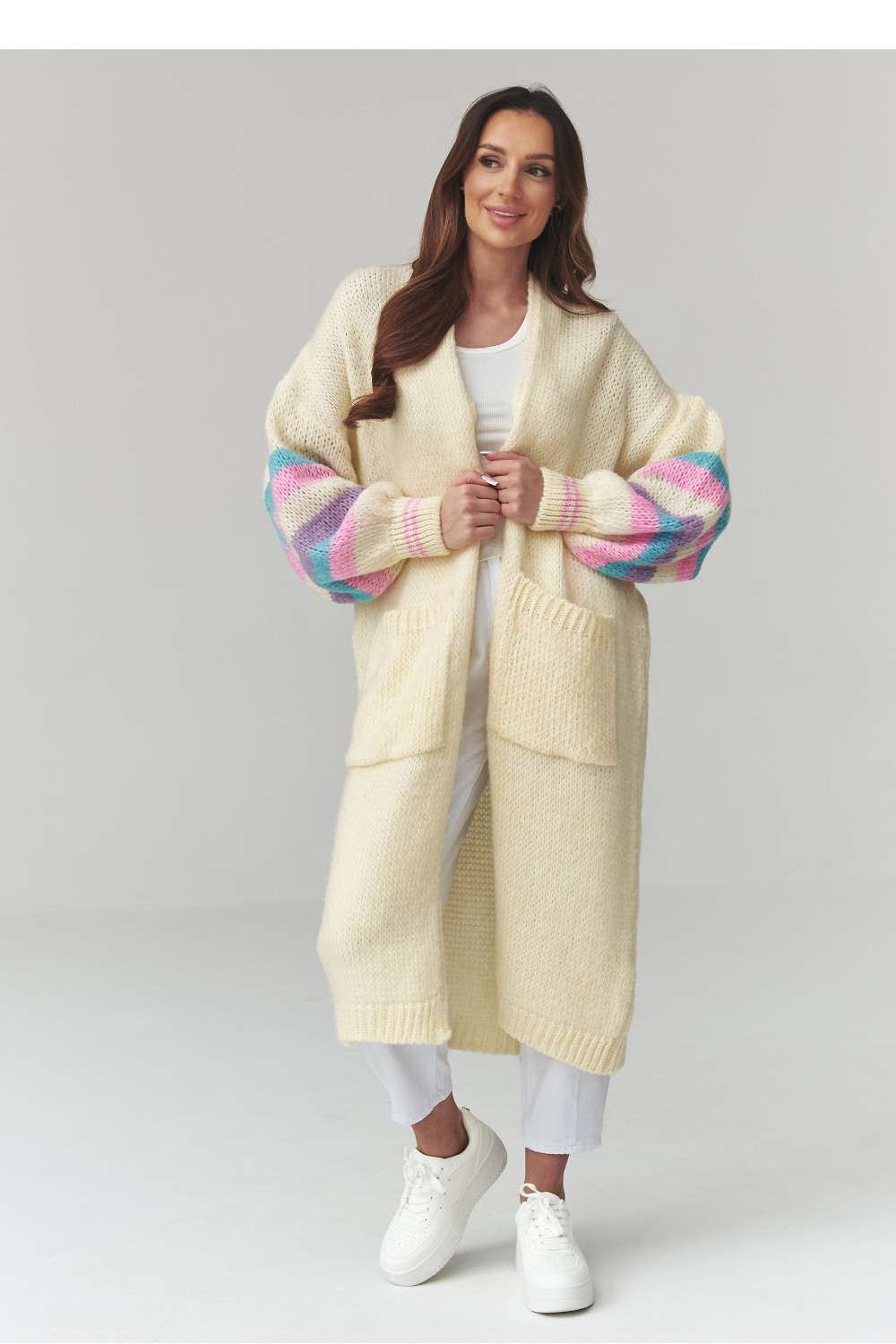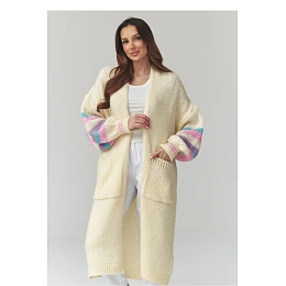 Dlouhý dámský svetr je ideální volbou pro ženy, které ocení pohodlí a styl ve svých každodenních outfitěch. Model ve formě dámského kardiganu se vyznačuje volným střihem a příjemným materiálem, díky kterému poskytuje pohodlí po celý den. Oversize svetr skvěle padne na postavě a umožňuje vytvářet moderní, vrstvené kombinace. Praktický kardigan s kapsami spojuje funkčnost s moderním designem. Velké kapsy mu dodávají charakter a delší střih zase zajišťuje, že dlouhý dámský kardigan se skvěle hodí jak k kalhotám, tak k legínám nebo šatům. Dekorativní vzor a stylové zakončení rukávů mu dodávají výjimečný vzhled. Univerzální dámský svetr na každý den se hodí do mnoha outfitů, od volných až po elegantní.