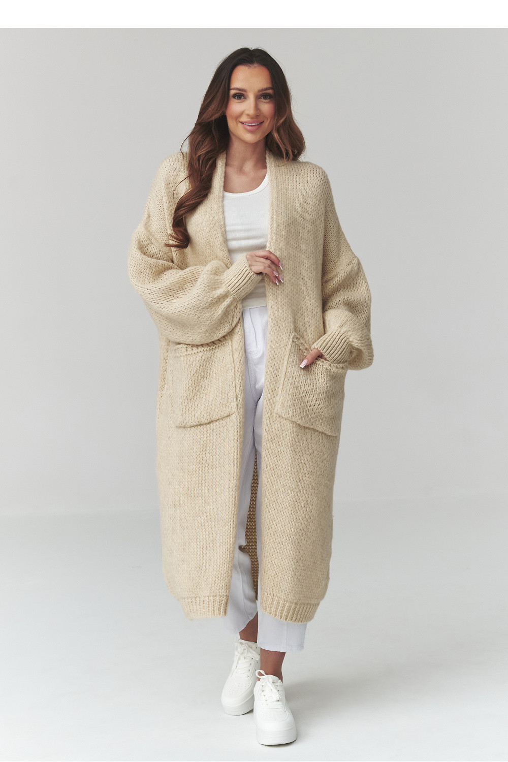 Tento dlouhý dámský svetr je ideální kombinací pohodlí, módního vzhledu a funkčnosti. Model ve formě oversized kardiganu se skvěle hodí do každodenních stylizací, poskytuje volnost pohybu a příjemné pocit obalení. Volný střih zajišťuje, že oversized svetr skvěle padne na postavu a hodí se k mnoha kouskům oblečení. Vyrobený z příjemné na dotek pleteniny dlouhý dámský kardigan se vyznačuje pečlivým provedením a moderním, minimalistickým designem. Praktické velké kapsy zvyšují funkčnost a delší střih zase zajišťuje, že tento model se ideálně hodí jako teplý svetr na každý den. Tento módní dámský svetr skvěle ladí jak s kalhotami, tak s legínami nebo šaty. Díky univerzálnímu střihu se skvěle hodí jako součást casual, městských i elegantních stylizací. Dámský kardigan je skvělou volbou pro ženy, které oceňují pohodlí, styl a nadčasovou módu.