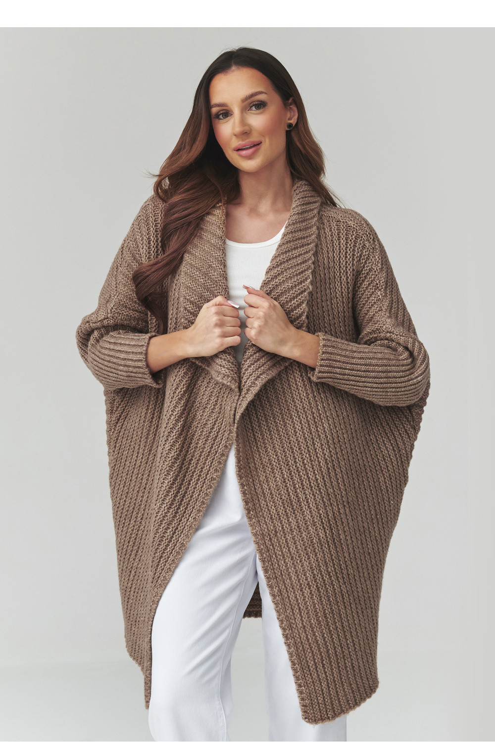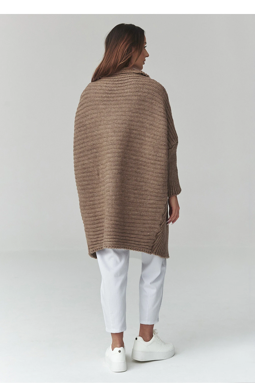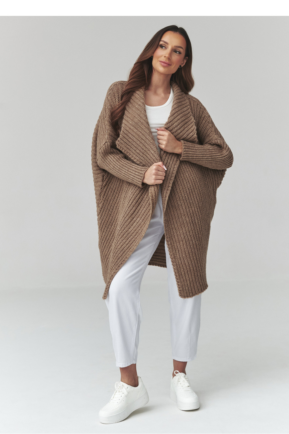 Tento dlouhý dámský svetr je skvělou volbou pro ženy, které ocení pohodlí, styl a nadčasový design. Model ve formě dámského kardiganu se vyznačuje volným střihem, díky čemuž se skvěle upravuje podle postavy a poskytuje plnou volnost pohybu. Moderní oversize svetr se skvěle hodí jak do každodenních stylizací, tak do elegantnějších kombinací. Vyrobený z příjemné pleteniny kardigan zaručuje pohodlí a dostatečné zahřátí v chladnějších dnech. Charakteristický vzor materiálu mu dodává jedinečný vzhled a delší střih zase zaručuje, že dlouhý oversize svetr skvěle ladí s kalhotami, legíny nebo šaty. Univerzální dámský svetr na každý den lze snadno sladit s mnoha stylizacemi, od neformálních po městské. Je to ideální kousek do šatníku pro ženy, které hledají módní kardigan, který spojuje pohodlí a styl.