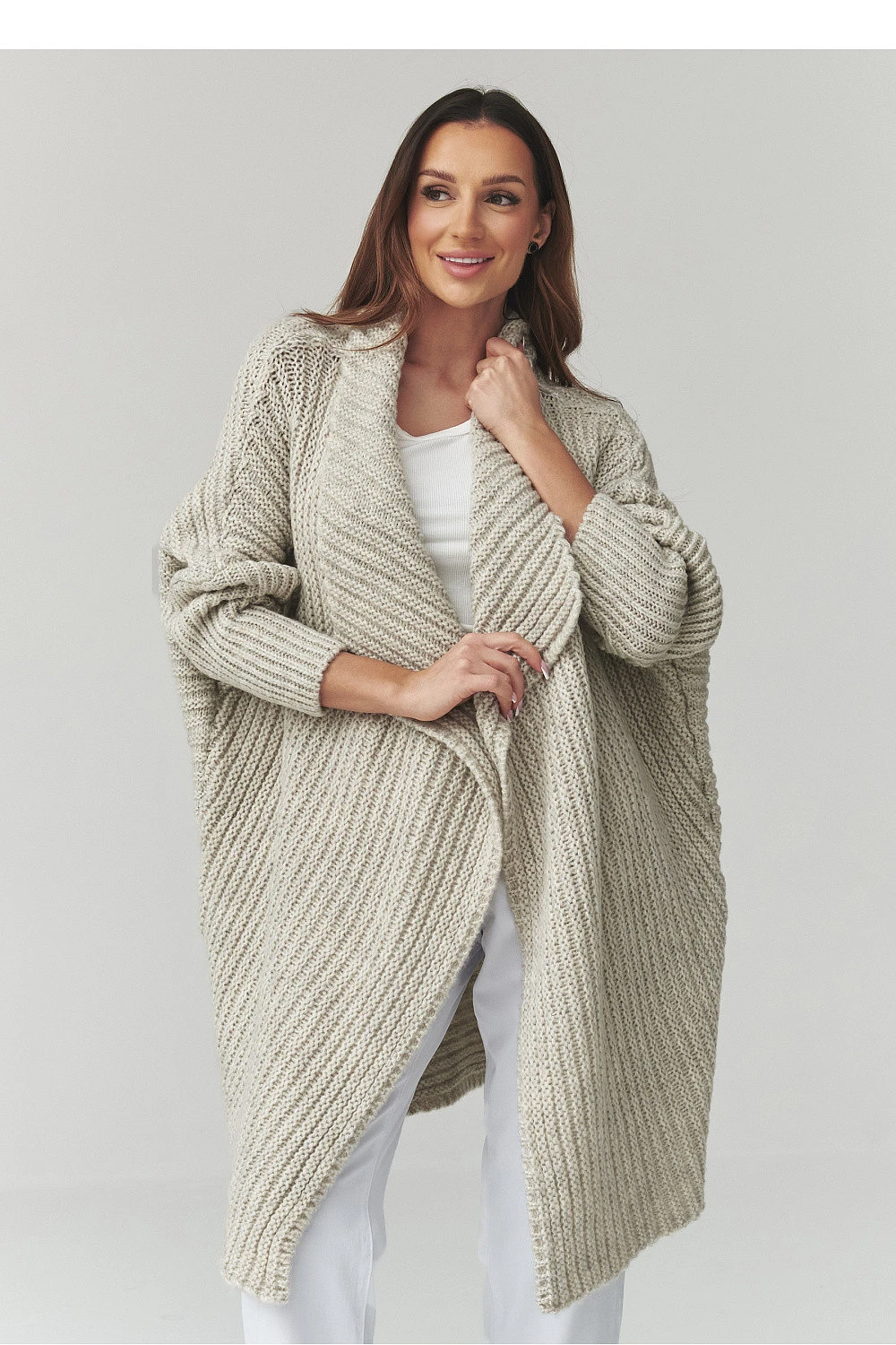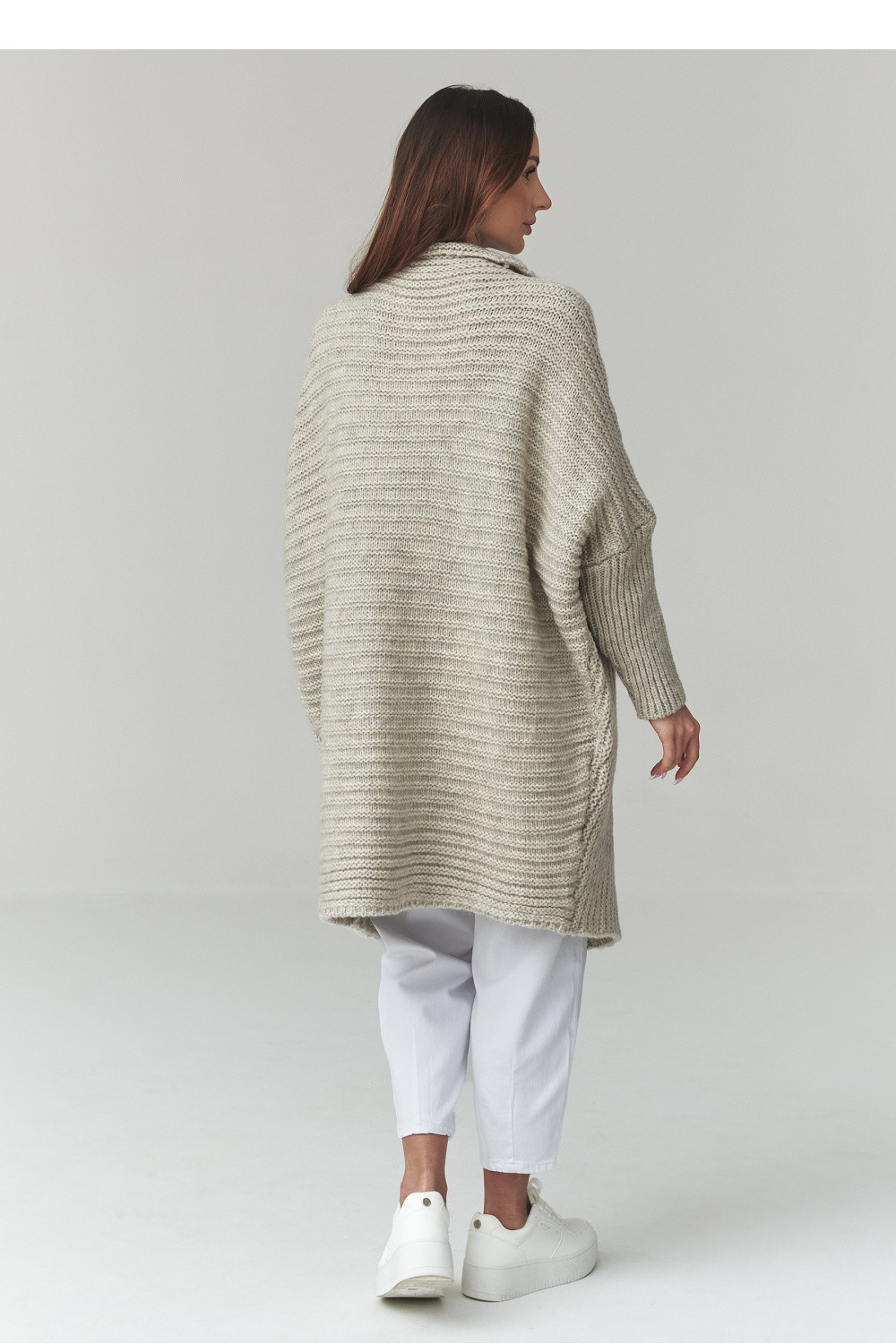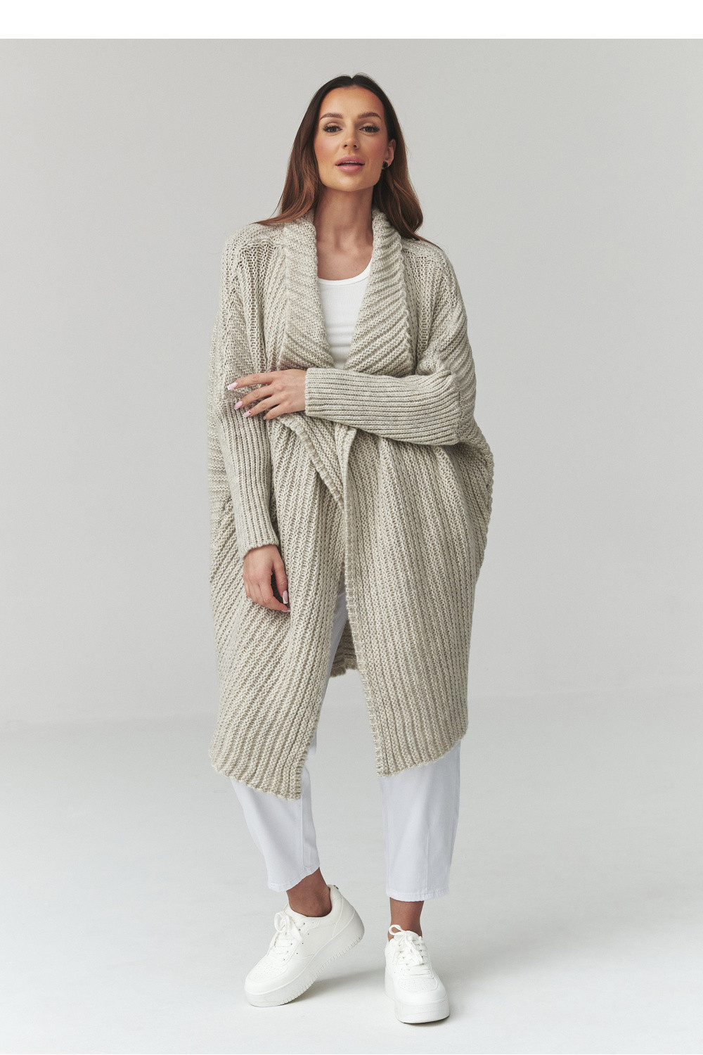 Tento dlouhý dámský svetr je skvělou volbou pro ženy, které oceňují pohodlí, styl a nadčasový design. Model ve formě dámského kardiganu se vyznačuje volným střihem, díky čemuž skvěle padne na postavě a poskytuje plnou volnost pohybu. Trendy oversized svetr se skvěle hodí jak do každodenních outfitů, tak do elegantnějších kombinací. Vyrobený z příjemné pleteniny kardigan dámský zajišťuje pohodlí nošení a dostatečné zahřátí v chladnějších dnech. Charakteristický vzor materiálu mu dodává jedinečný vzhled a delší střih zase zajišťuje, že dlouhý oversized svetr skvěle ladí s kalhotami, legíny nebo šaty. Univerzální dámský svetr na každý den lze snadno sladit s mnoha stylizacemi, od ležérních až po městské. Je to ideální kousek do šatníku pro ženy, které hledají módní kardigan dámský spojující pohodlí a styl.