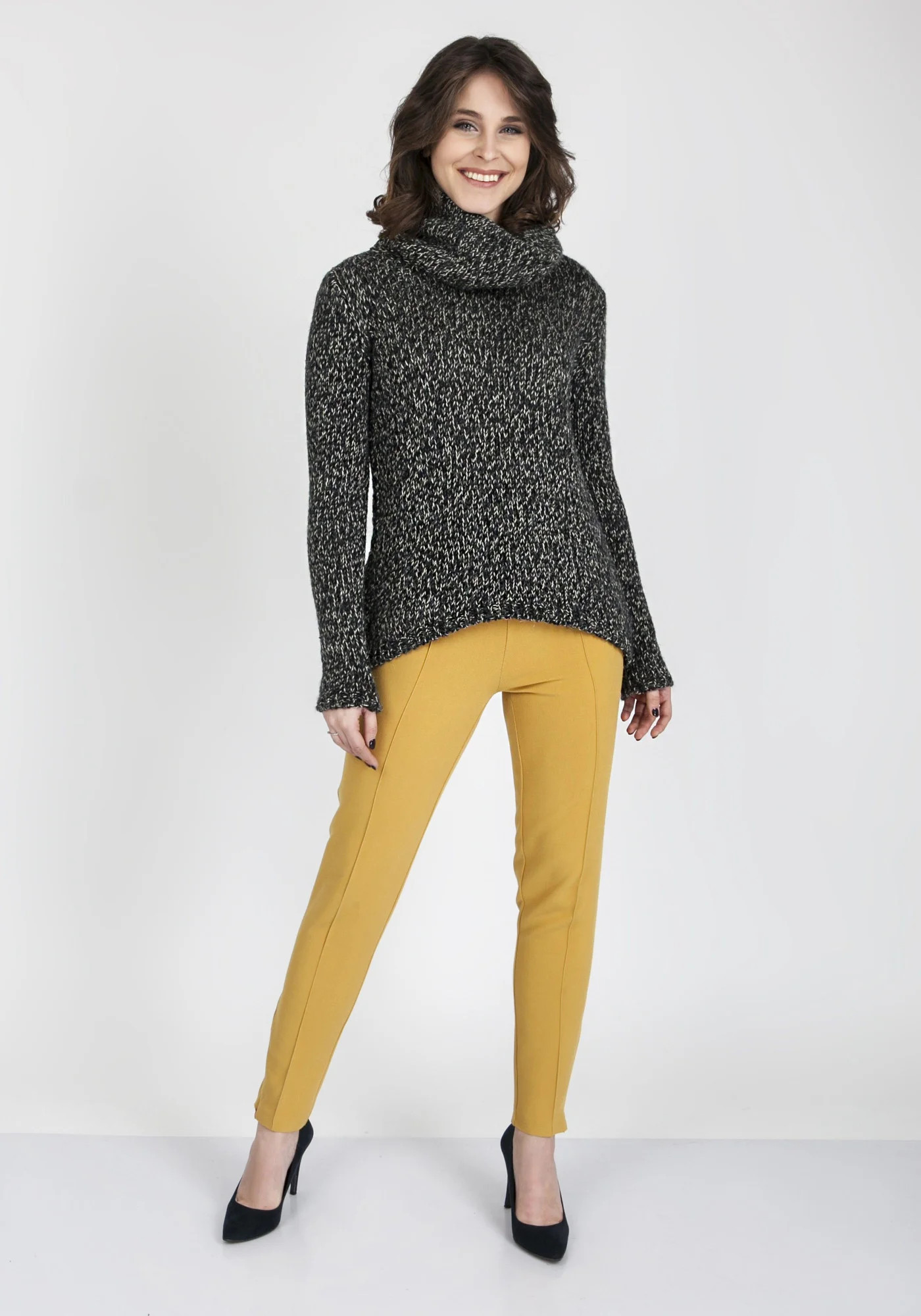 Výjimečně zajímavý svetr s rolákem, vyrobený z měkké, na dotek příjemné příze. Dvoubarevná příze vytváří mírně melanžový efekt. Střih svetru je jednoduchý a pohodlný, s polokřivým lemem vpředu a klasickou rovnou linií vzadu. Výrobek polské značky MKM. Složení: 80% akryl, 10% vlna, 10% polyamid.
