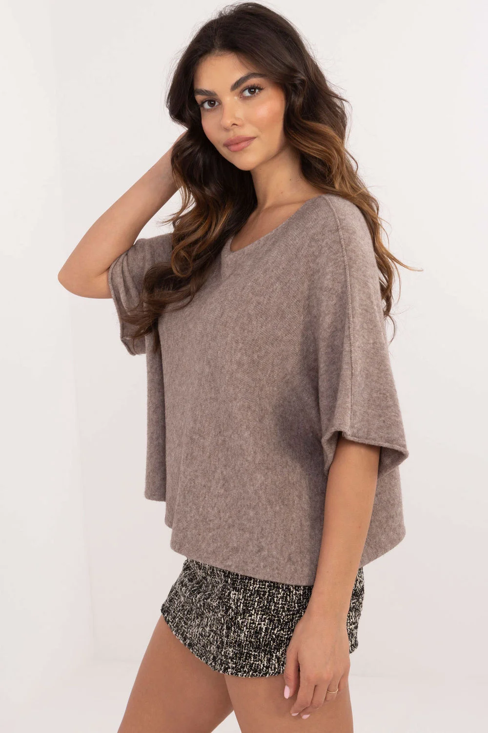 Elegantní oversized dámský svetr, který se skvěle hodí jak na každý den, tak do práce. Vyrobena z směsi viskózy, polyesteru a nylonu, poskytuje pohodlí a styl. Svetr je oboustranný, co umožňuje vytváření různých stylizací. Má hladkou strukturu, díky čemuž se hodí k mnoha outfitům, a jeho krátká délka a 3/4 rukávy mu dodávají moderní charakter. Kulatý výstřih zdůrazňuje krk a absenci zapínání dodává celku lehkost a volnost. Je to ideální volba pro ženy, které si cení eleganci spojenou s pohodlím.