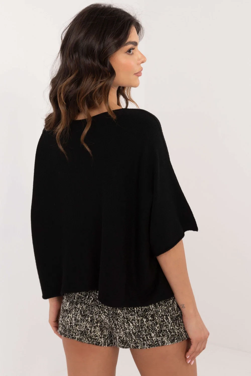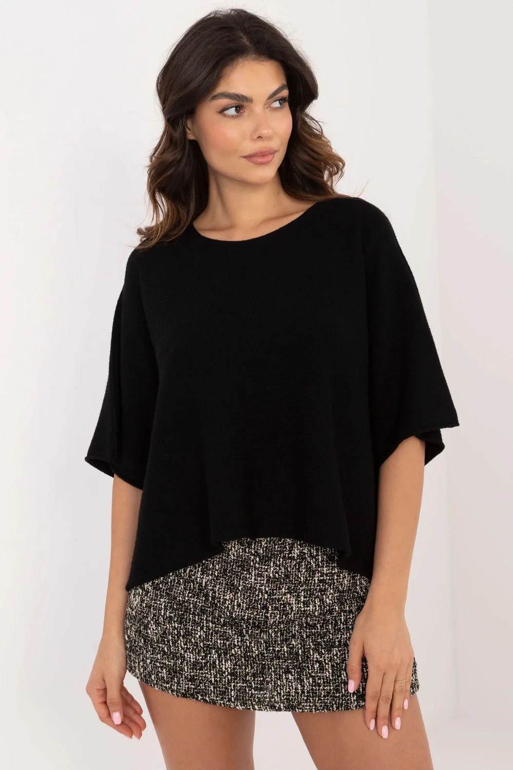 Elegantní dámský oversized svetr, který se skvěle hodí jak do každodenního života, tak do práce. Vyrobený z směsi viskózy, polyesteru a nylonu, poskytuje pohodlí a styl. Svetr je oboustranný, co umožňuje vytváření různých stylizací. Má hladkou strukturu, díky čemuž se hodí k mnoha outfitům, a jeho krátká délka a 3/4 rukávy mu dodávají moderní charakter. Kulatý výstřih zdůrazňuje krk, a absenci zapínání dodává celku lehkost a volnost. Je to ideální volba pro ženy, které si cení eleganci spojenou s pohodlím.