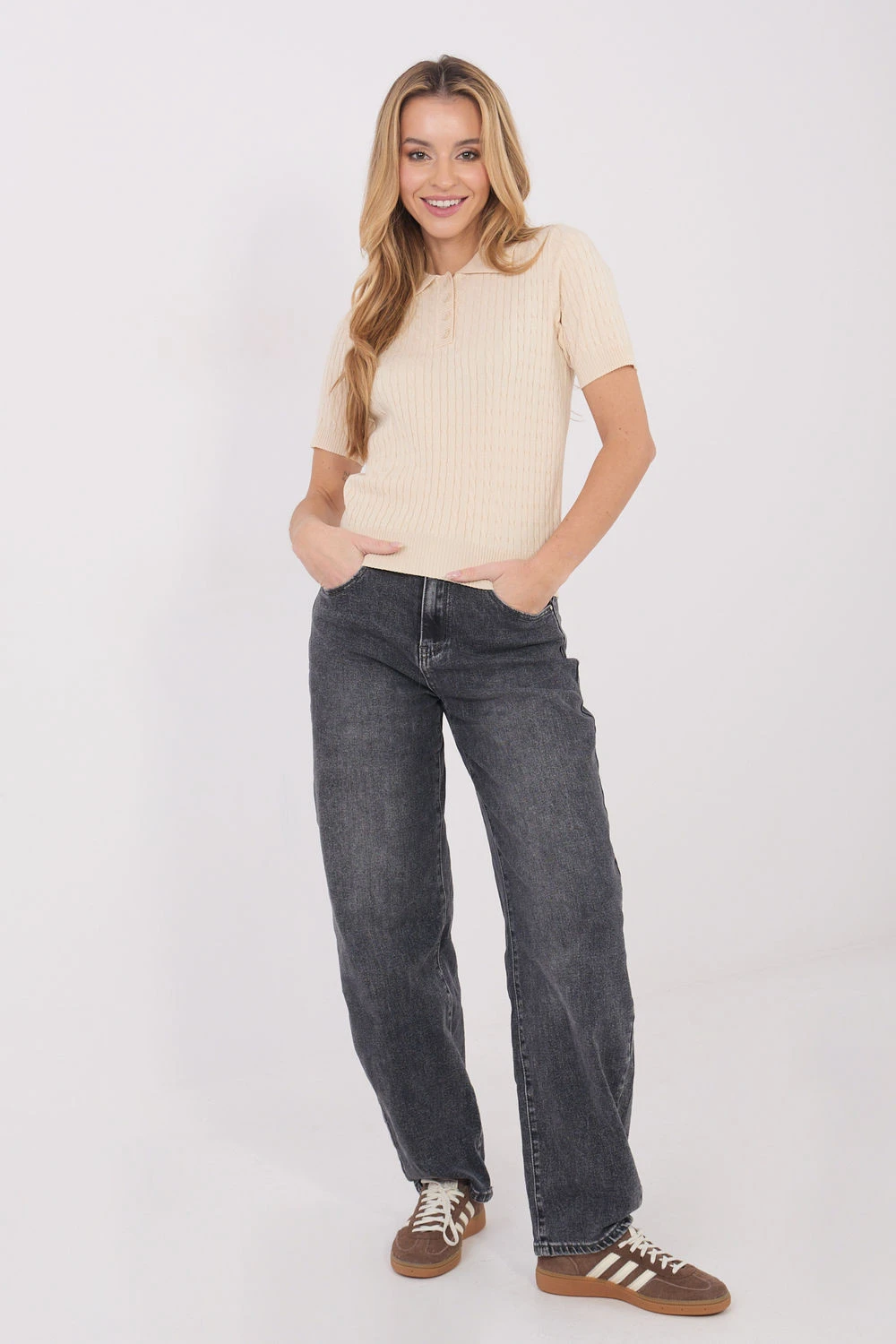 Elegantní dámský svetr s ležérním charakterem, ideální pro každodenní outfit i do práce. Model se vyznačuje různorodou texturou materiálu, která dodává celku elegantní a zároveň moderní vzhled. Svetr je vyroben z kombinace viskózy a nylonu, díky čemuž je měkký, příjemný na dotek a odolný. Standardní délka činí střih univerzálním a snadno kombinovatelným jak s kalhotami, tak s sukní. Krátký rukáv dodává lehkost a činí model skvělým pro teplejší dny nebo jako součást vrstveného outfitu. Další výhodou je límec a zapínání na knoflíky typu polo, které dávají svetru klasický, lehce sportovní charakter. To je skvělá volba pro ženy, které oceňují pohodlí, funkčnost a nadčasový styl na každý den.