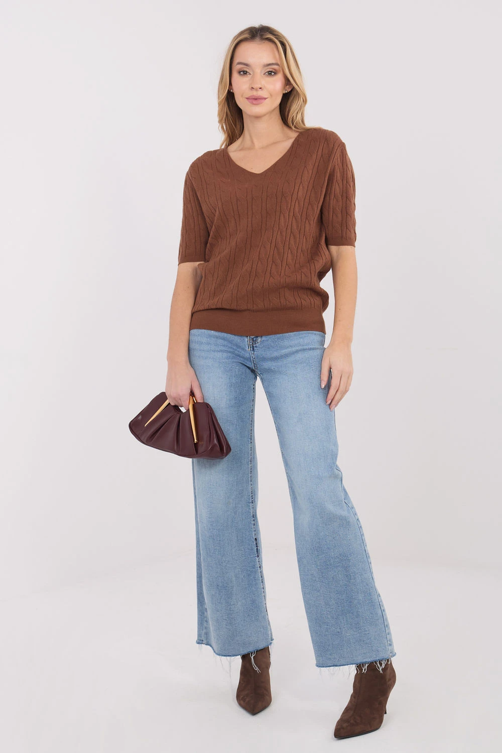 Každodenní dámský svetr vyrobený z elastické směsi viskózy, polyesteru a polyamidu, který poskytuje pohodlí a lehkost nošení. Výstřih do V dodává siluetě jemnou eleganci a krátký rukáv zase dělá svetr skvělým pro každodenní outfit a do práce. Různorodá struktura materiálu dodává celku zajímavý charakter a standardní délka umožňuje snadné kombinování svetru s různými kalhotami a sukněmi. Model bez zapínání, jednoduchý a univerzální, ideální pro každodenní a pracovní outfity.