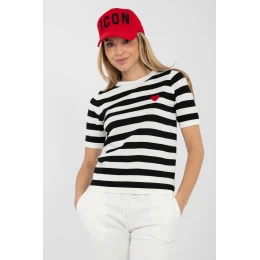 Elegantní pruhovaný dámský svetr je ideální volbou pro ženy, které si cení pohodlí a módního, ležérního stylu. Klasický pruhovaný vzor mu dodává nadčasový charakter a skvěle zapadá do každodenních outfitů. Model s standardní délkou se skvěle tvaruje podle postavy, a krátký rukáv zajišťuje pohodlí při nošení, zejména v teplejších dnech nebo jako součást vrstvených outfitů. Kulatý výstřih zdůrazňuje univerzální charakter svetru a dělá ho vhodným jak k džínům, tak ke sukním nebo elegantním kalhotám. Svetr je vyroben z vysoce kvalitní směsi viskózy a polyesteru, díky čemuž je materiál měkký, příjemný na dotek a odolný proti mačkání. Okouzlujícím prvkem je vyšité srdíčko na hrudi vlevo, které celkově dodává subtilní, ženský charakter. Jedná se o skvělou volbu na každodenní nošení do práce, na setkání s přáteli nebo pro procházku.