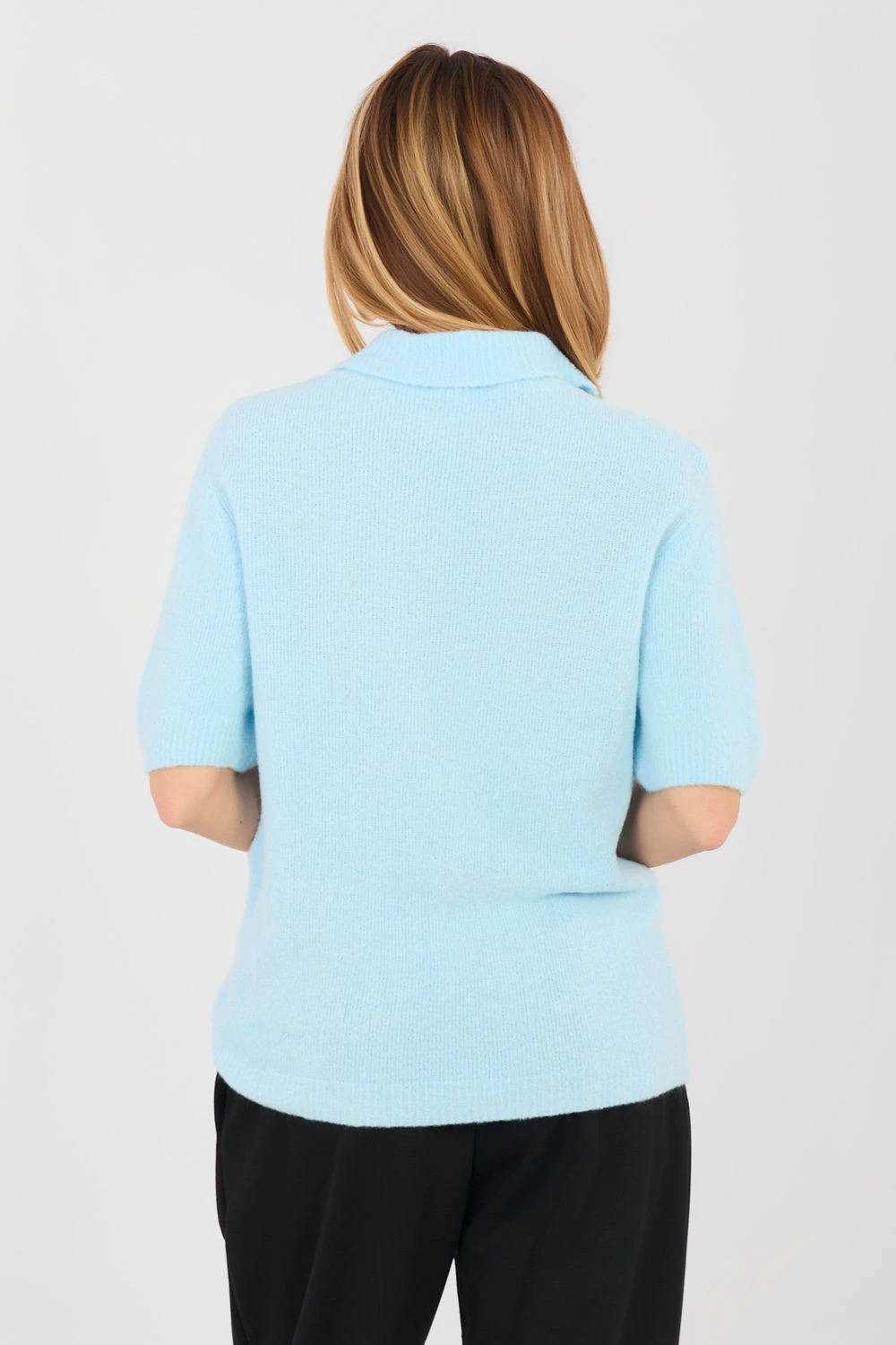 Dámský polo svetr s ležérním charakterem je stylový a pohodlný návrh na každý den i do práce. Model standardní délky se vyznačuje klasickým límcem, který celku dodává elegantní a uklizený vzhled. Krátký rukáv zase zaručuje, že se svetr skvěle hodí do teplejších dní nebo jako součást vrstveného outfitu. Hladký vzor zdůrazňuje jeho univerzální charakter a umožňuje snadné sladění s různými kousky šatníku, ať už elegantními kalhotami, sukní nebo džínami. Vyrobený z kombinace akrylu, baby alpaky a polyamidu je měkký, příjemný na dotek a pohodlný na nošení. Přídavek baby alpaky zajišťuje jemnost a decentní teplo, zatímco příměs syntetických vláken zvyšuje odolnost a odolnost proti deformacím. Jedná se o nadčasový model, který spojuje pohodlí s elegantním zpracováním.