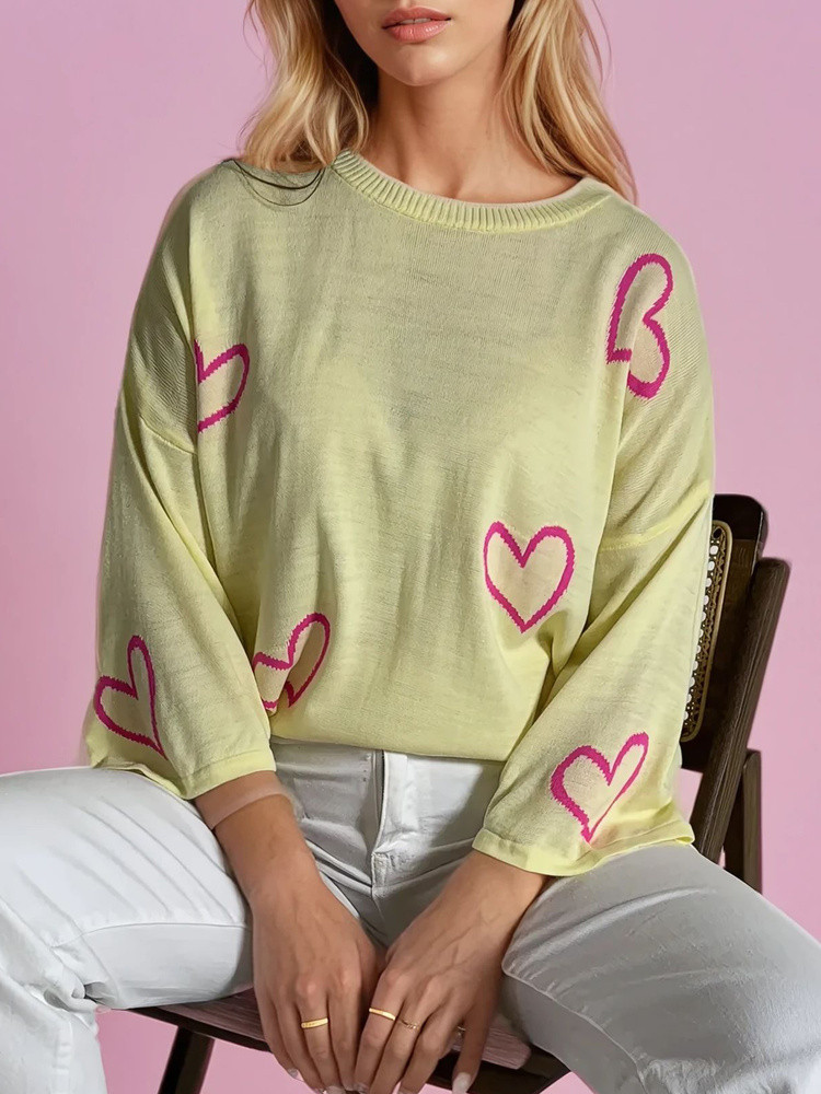 Tento jemný svetr nadměrné velikosti s dívčím potiskem srdíček je okouzlující volbou pro krásný jarní komplet a je k dispozici ve třech barevných provedeních.