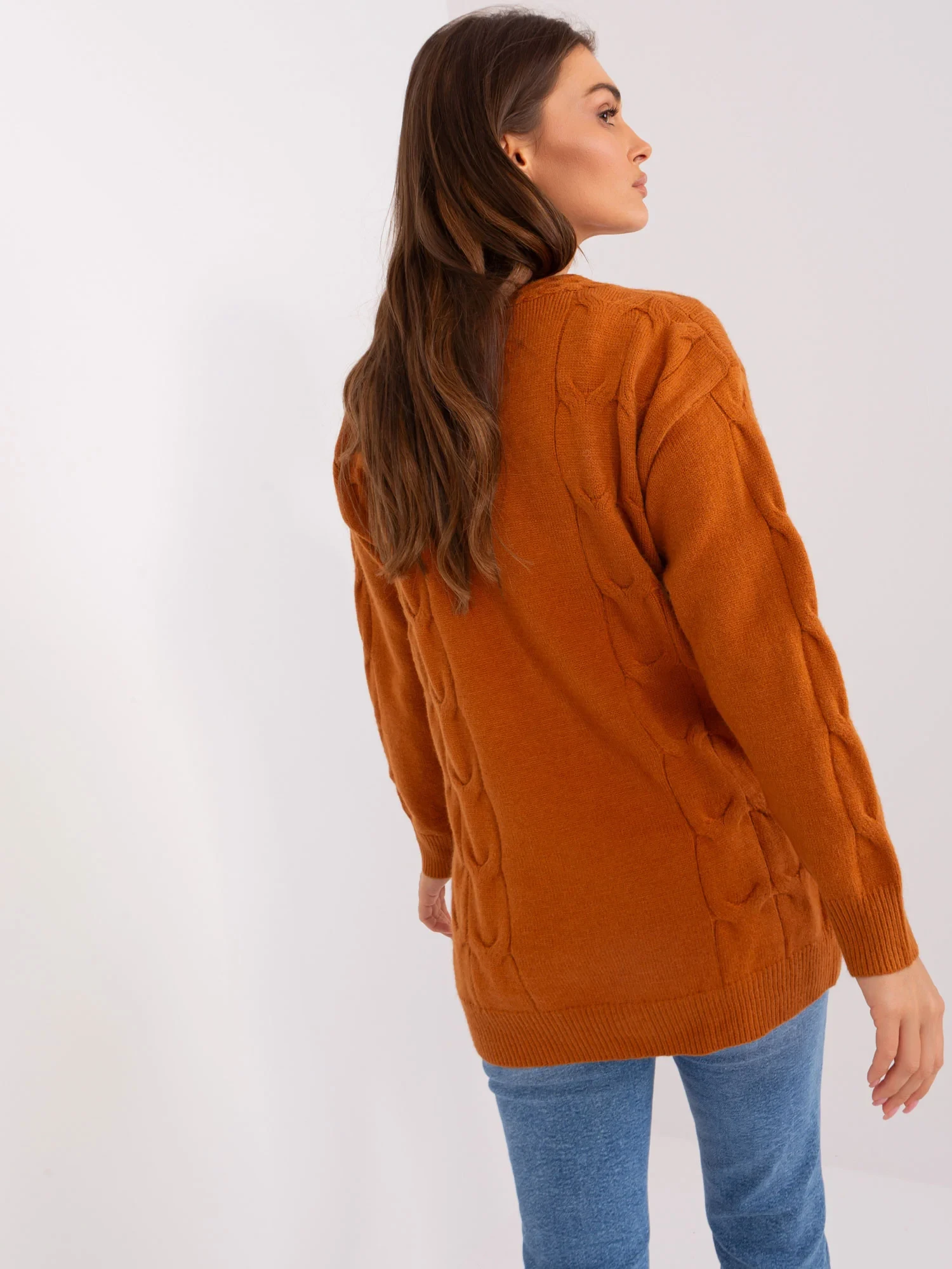 Wymiary swetra w rozmiarze one size mierzone na płasko: szerokość pod pachami - 58 cm, długość rękawa - 58 cm, długość całkowita - 74 cm.