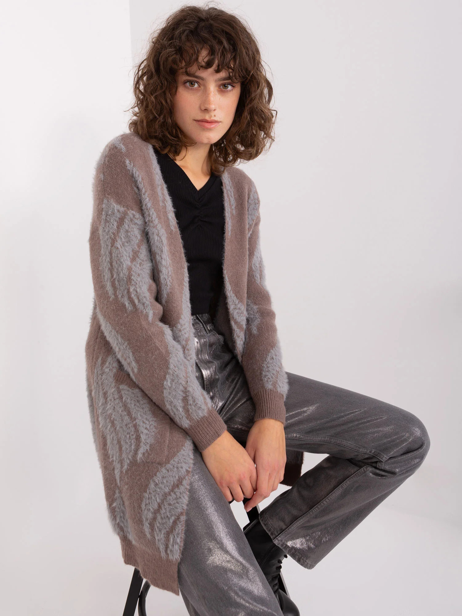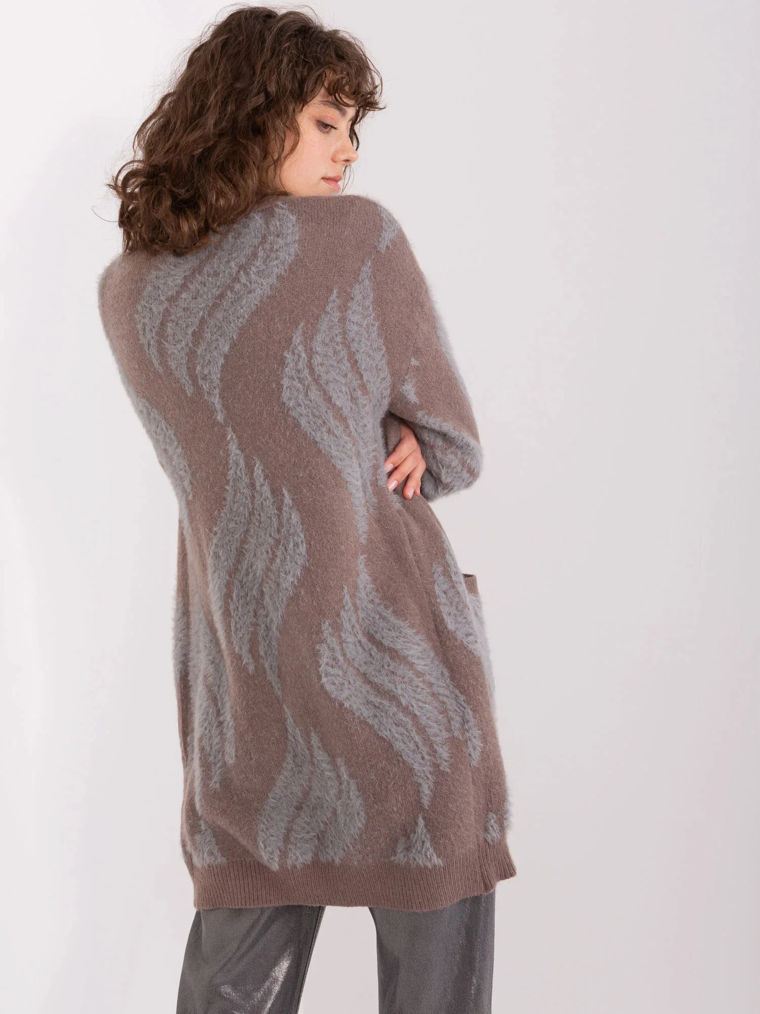 Wymiary kardiganu w rozmiarze one size mierzone na płasko: szerokość pod pachami - 65 cm, długość całkowita - 87 cm, długość rękawa - 60 cm.