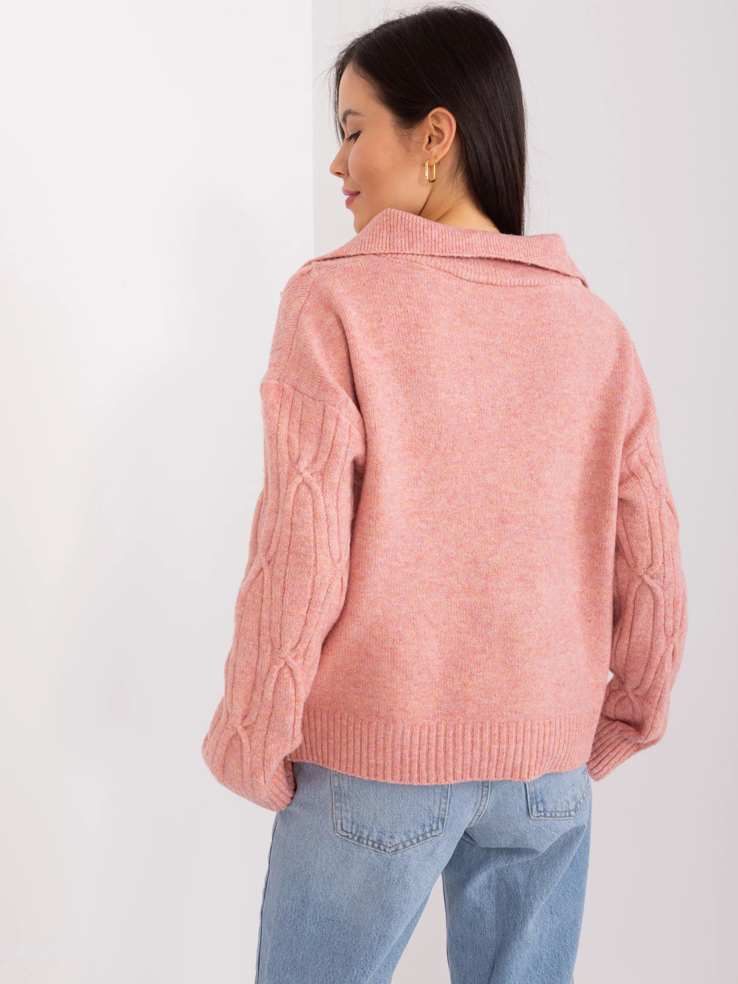 Wymiary swetra w rozmiarze one size mierzone na płasko: szerokość pod pachami - 52 cm, długość rękawa - 56 cm, długość całkowita - 55 cm.