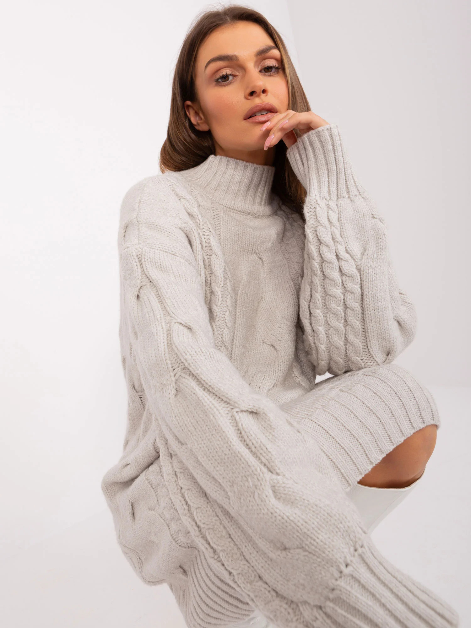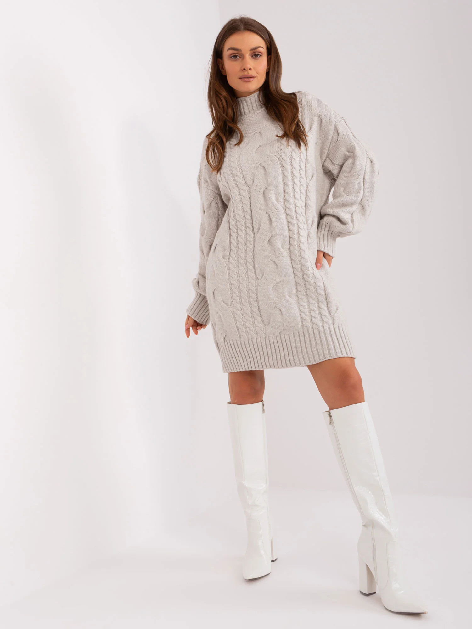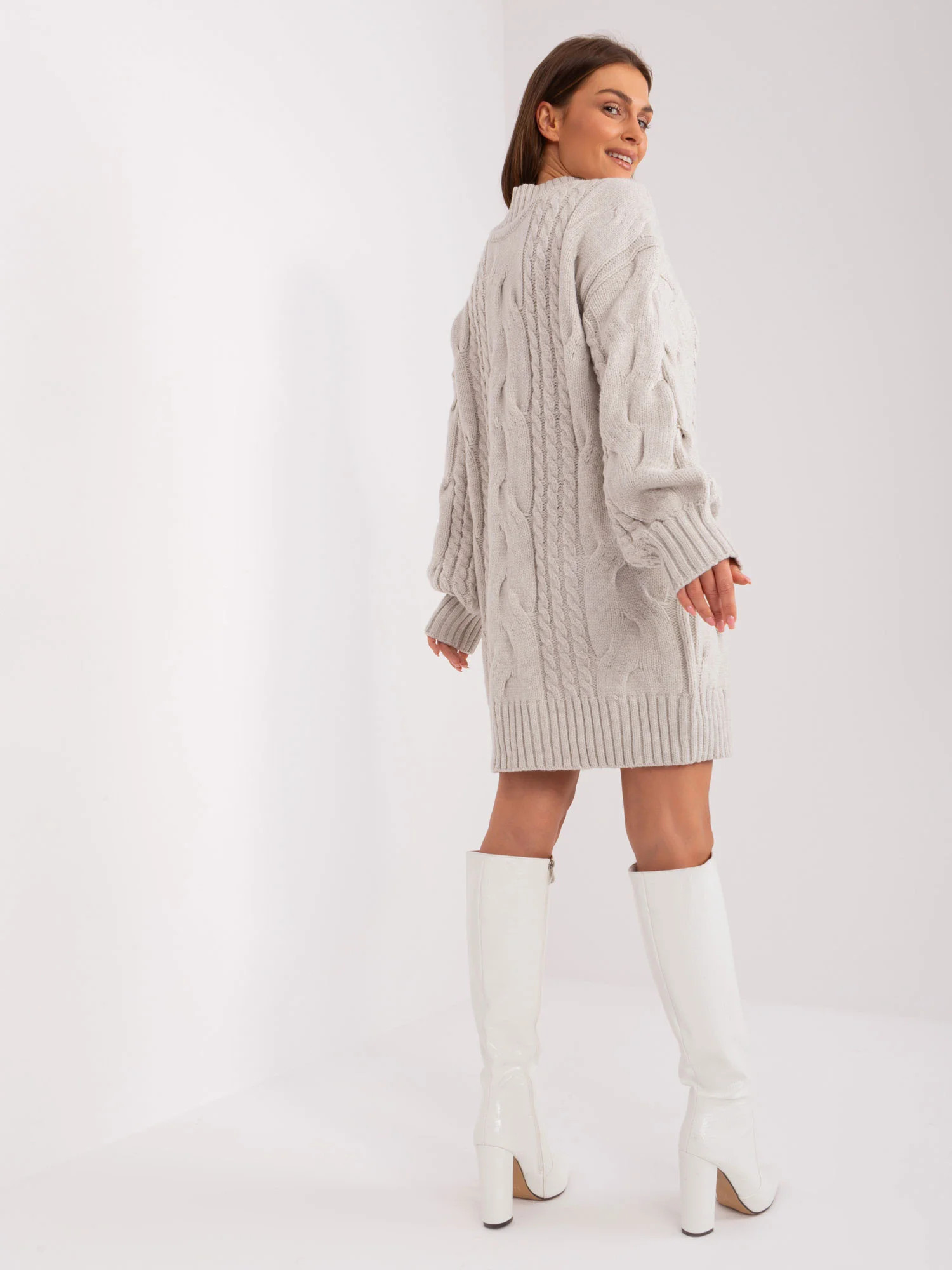 Wymiary swetra w rozmiarze one size mierzone na płasko: szerokość pod pachami - 60 cm, długość rękawa - 63 cm, długość całkowita - 64 cm.