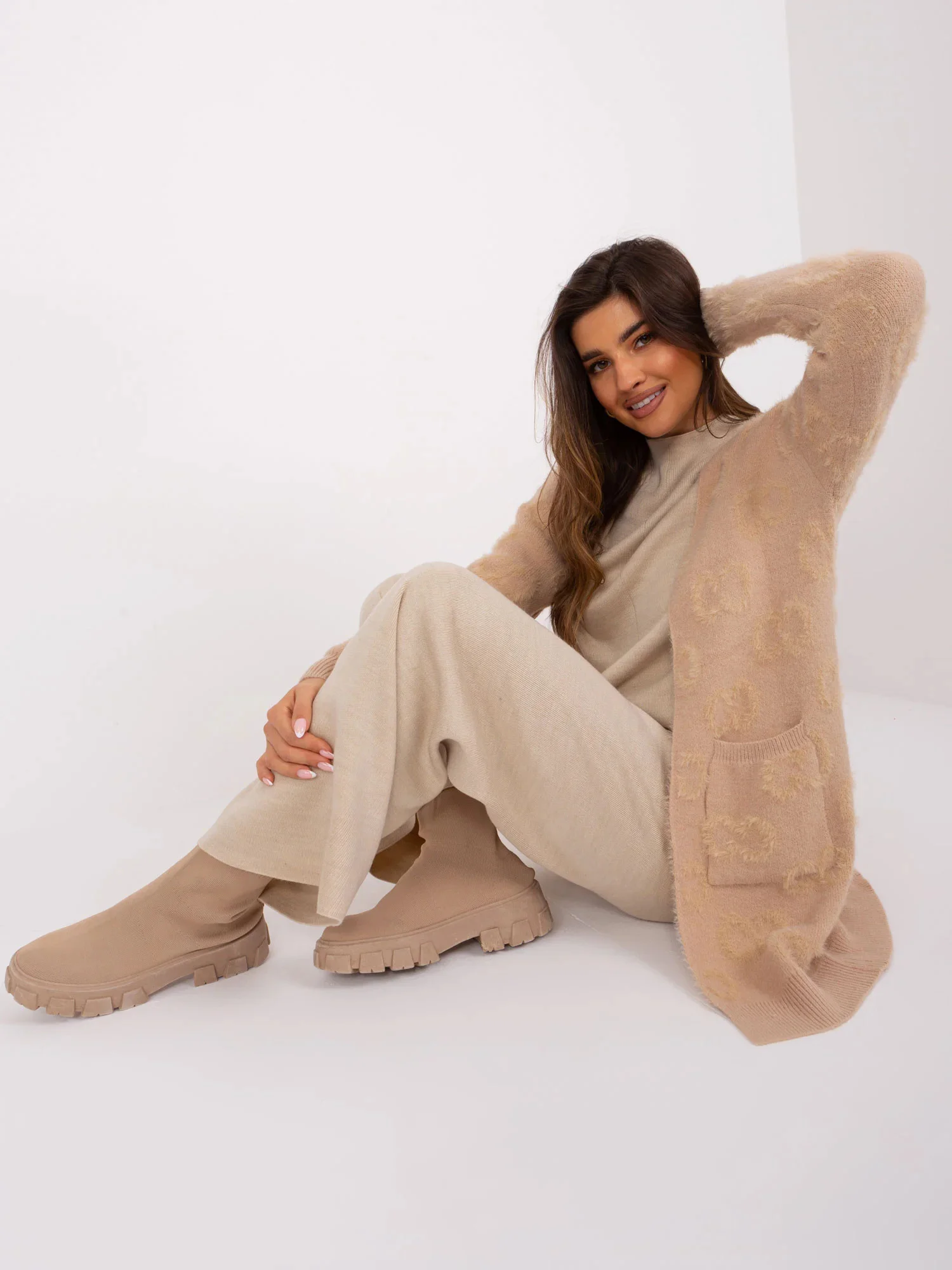 Wymiary kardiganu w rozmiarze one size mierzone na płasko: szerokość pod pachami - 65 cm, długość całkowita - 82 cm, długość rękawa - 60 cm.