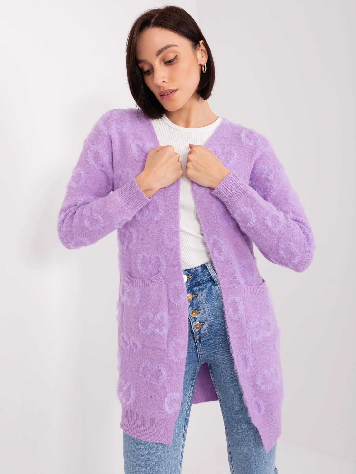 Wymiary kardiganu w rozmiarze one size mierzone na płasko: szerokość pod pachami - 65 cm, długość całkowita - 82 cm, długość rękawa - 60 cm.