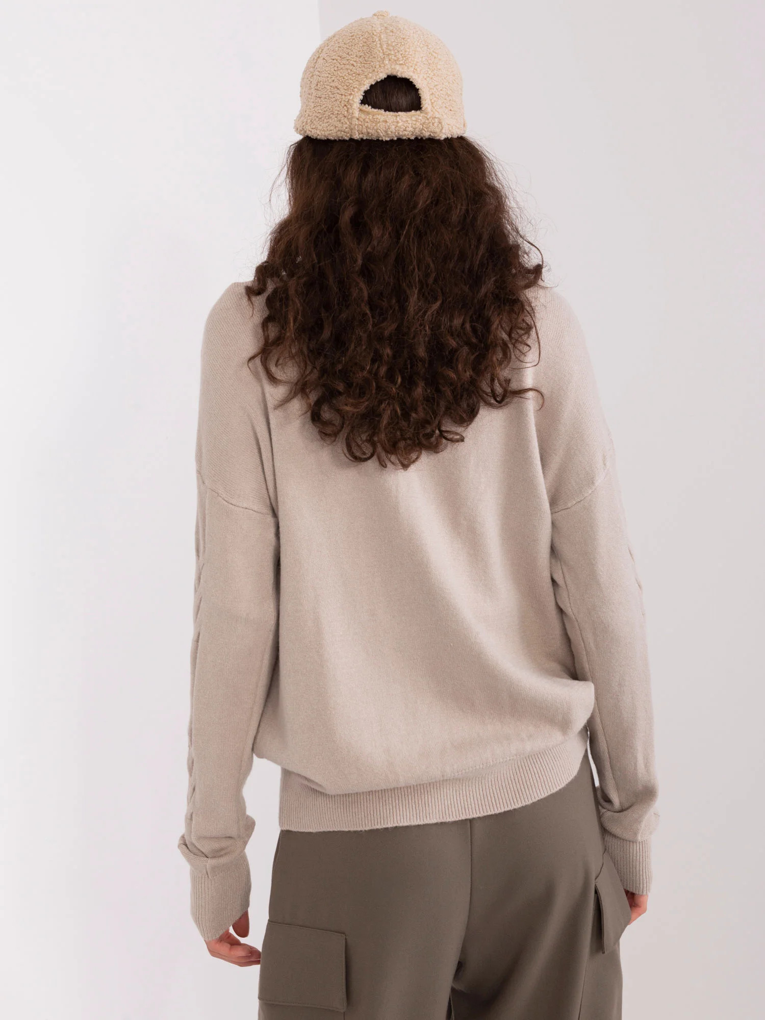 Wymiary swetra w rozmiarze one size mierzone na płasko: szerokość pod pachami - 64 cm, długość rękawa - 65 cm, długość całkowita - 67 cm.