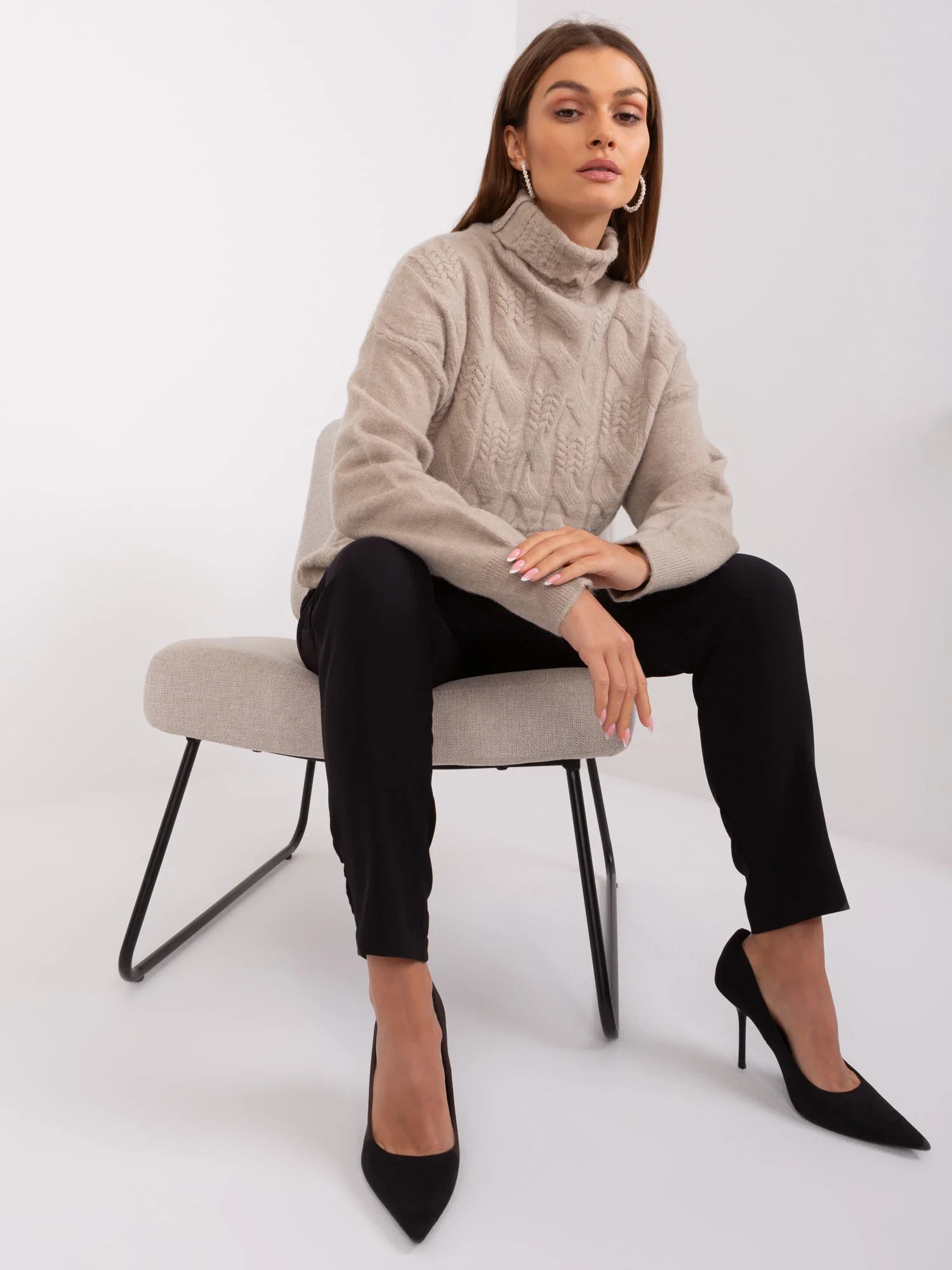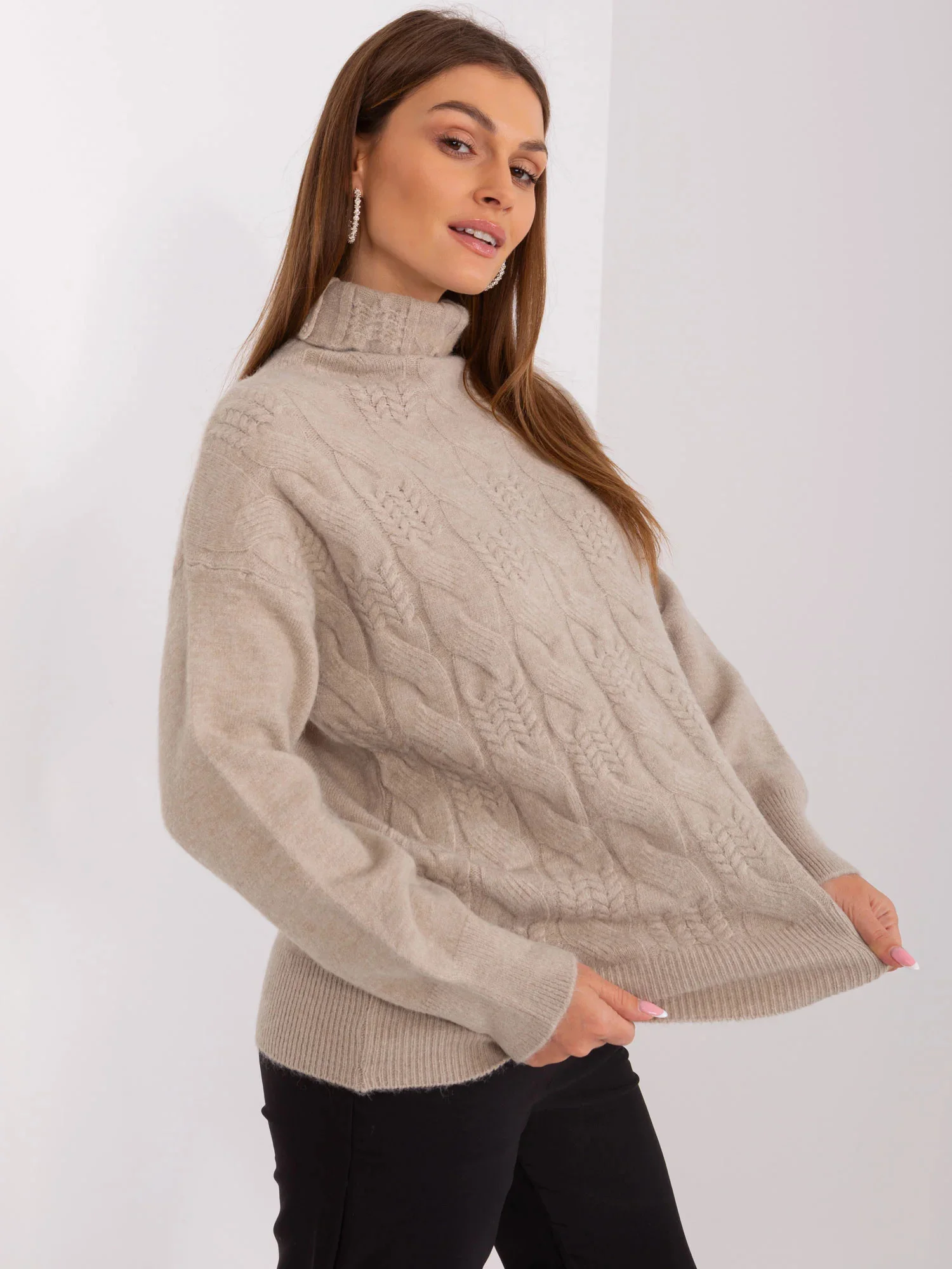 Wymiary swetra w rozmiarze one size mierzone na płasko: szerokość pod pachami - 52 cm, długość całkowita - 64 cm, długość rękawa - 59 cm.