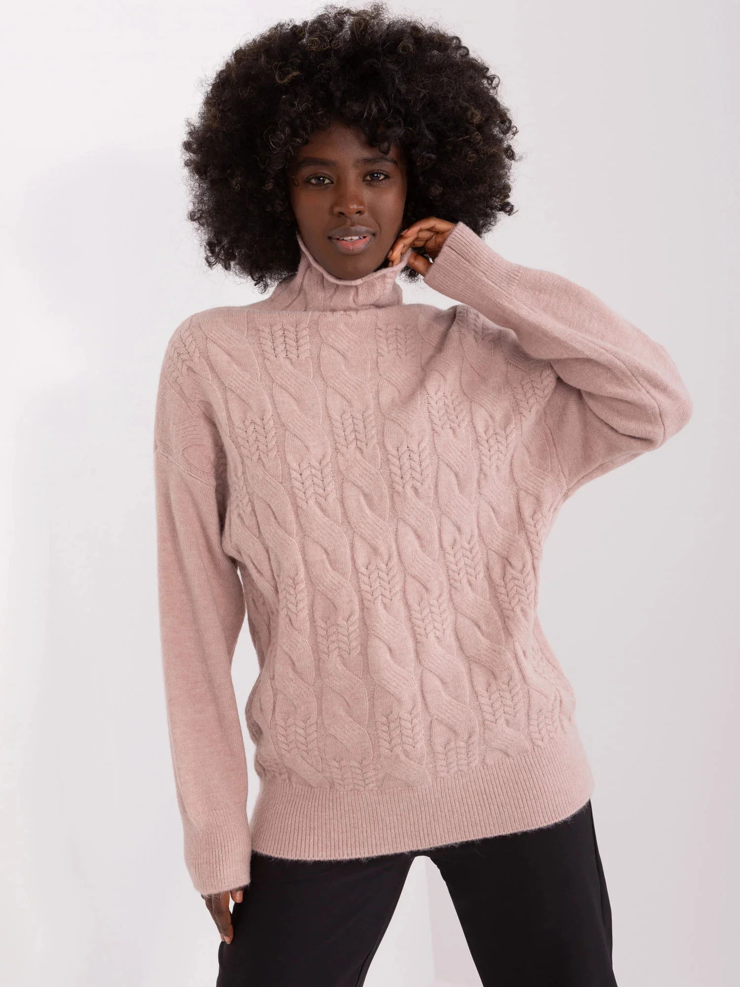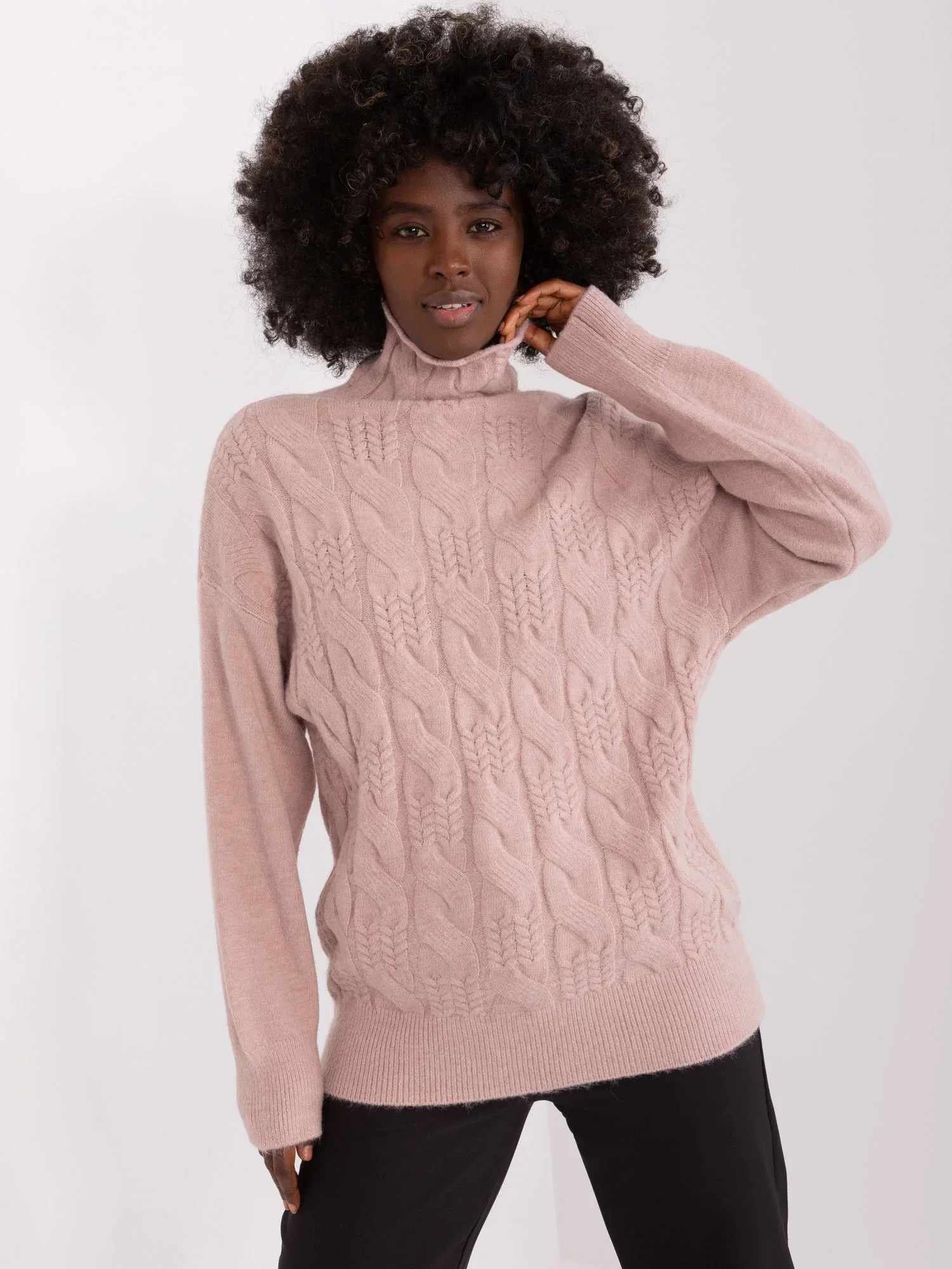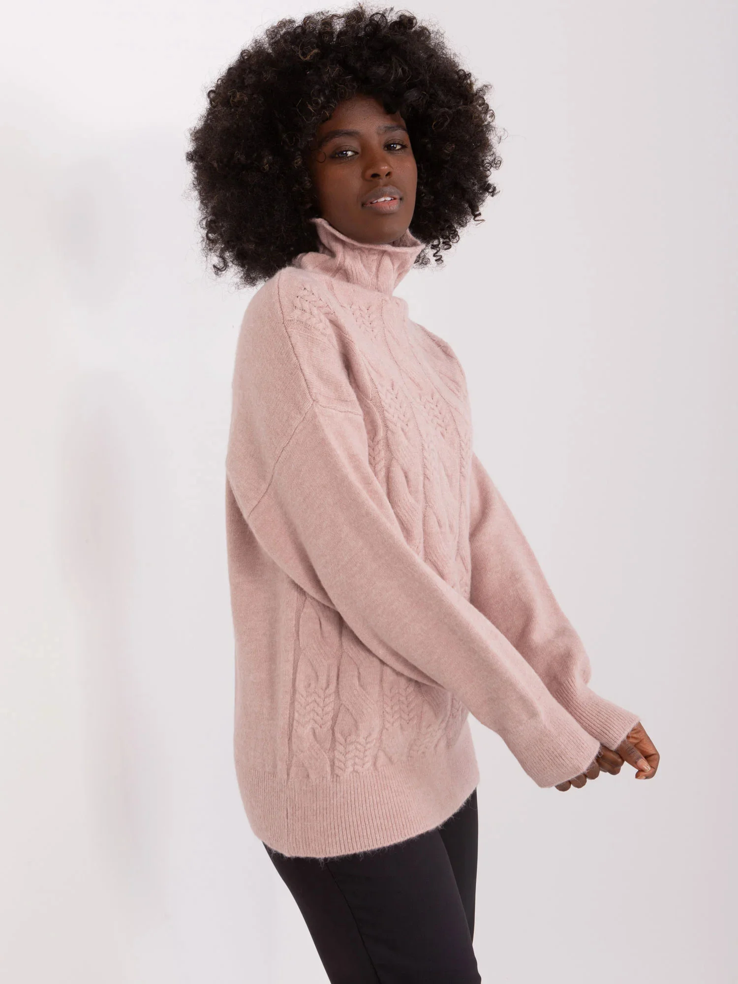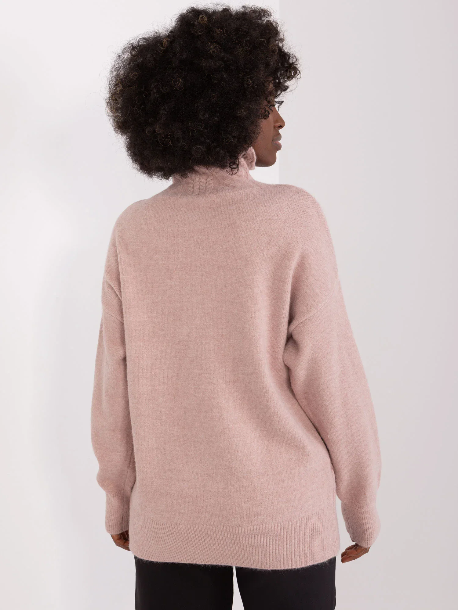 Wymiary swetra w rozmiarze one size mierzone na płasko: szerokość pod pachami - 52 cm, długość całkowita - 64 cm, długość rękawa - 59 cm.