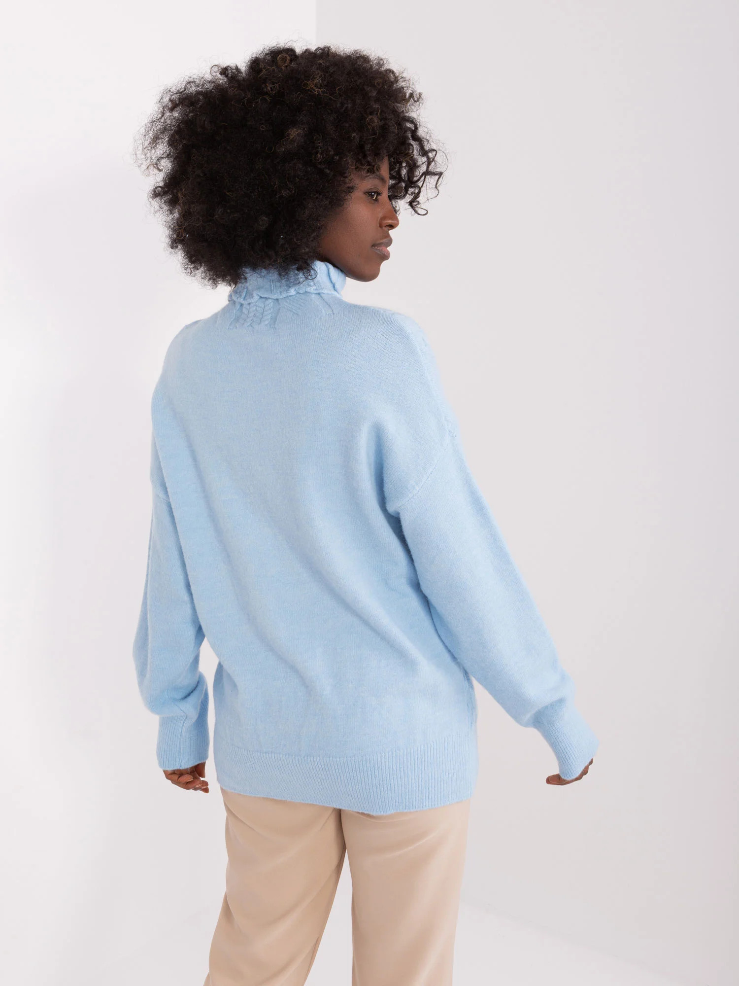 Wymiary swetra w rozmiarze one size mierzone na płasko: szerokość pod pachami - 52 cm, długość całkowita - 64 cm, długość rękawa - 59 cm.