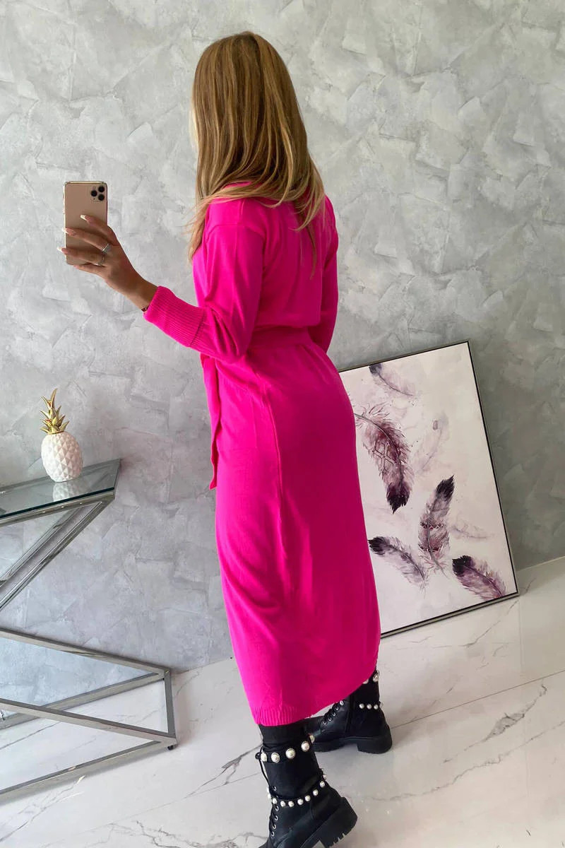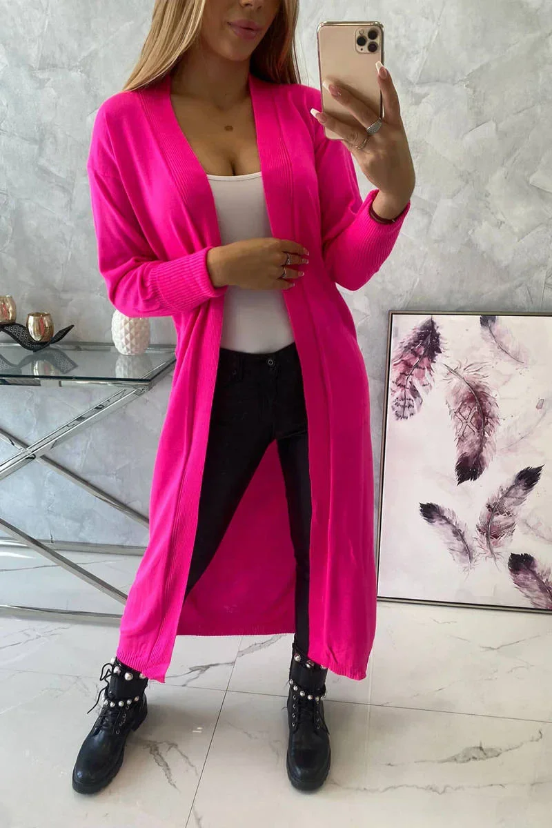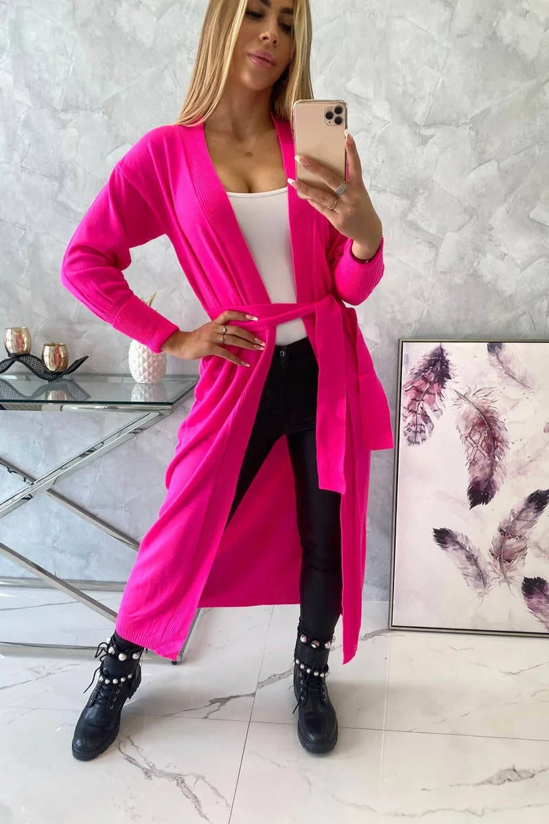 Sweter długi kardigan wiązany w talii różowy neon