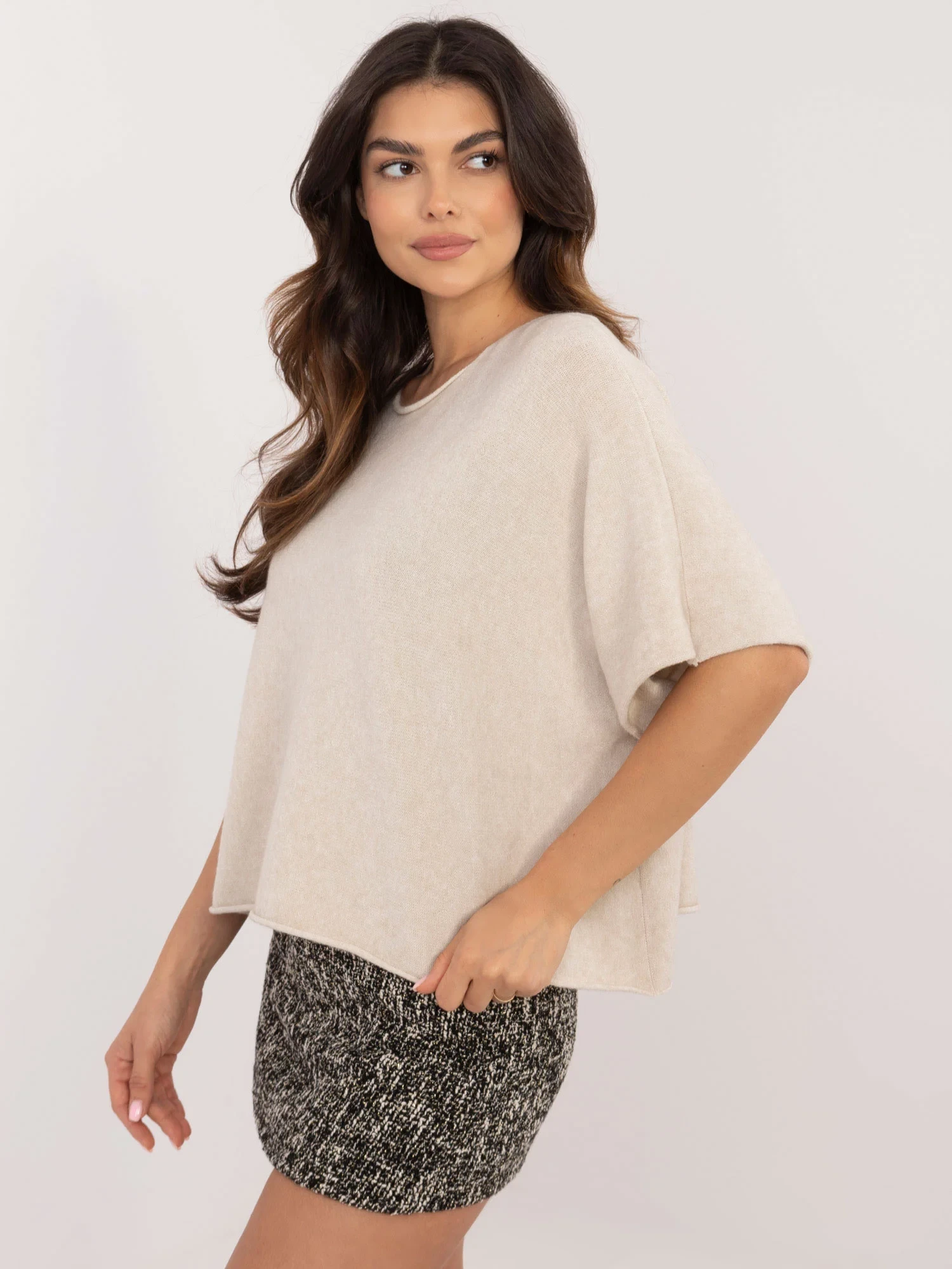Wymiary swetra w rozmiarze one size: szerokość pod pachami - 75 cm, długość rękawa - 40 cm, długość całkowita - 55 cm.