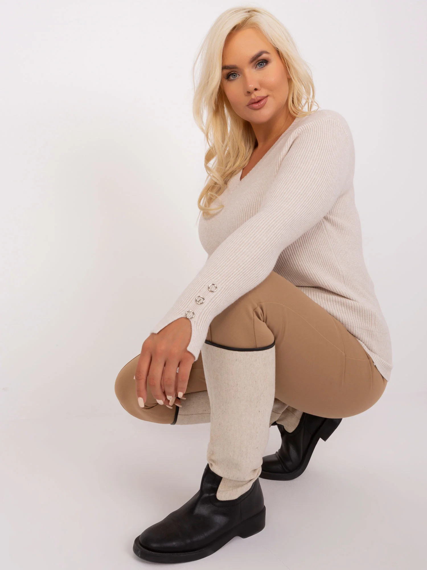 Modelka ma na sobie rozmiar L/XL. Wymiary modelki: wzrost 172 cm, biust 103 cm, talia 73 cm, biodra 103 cm.