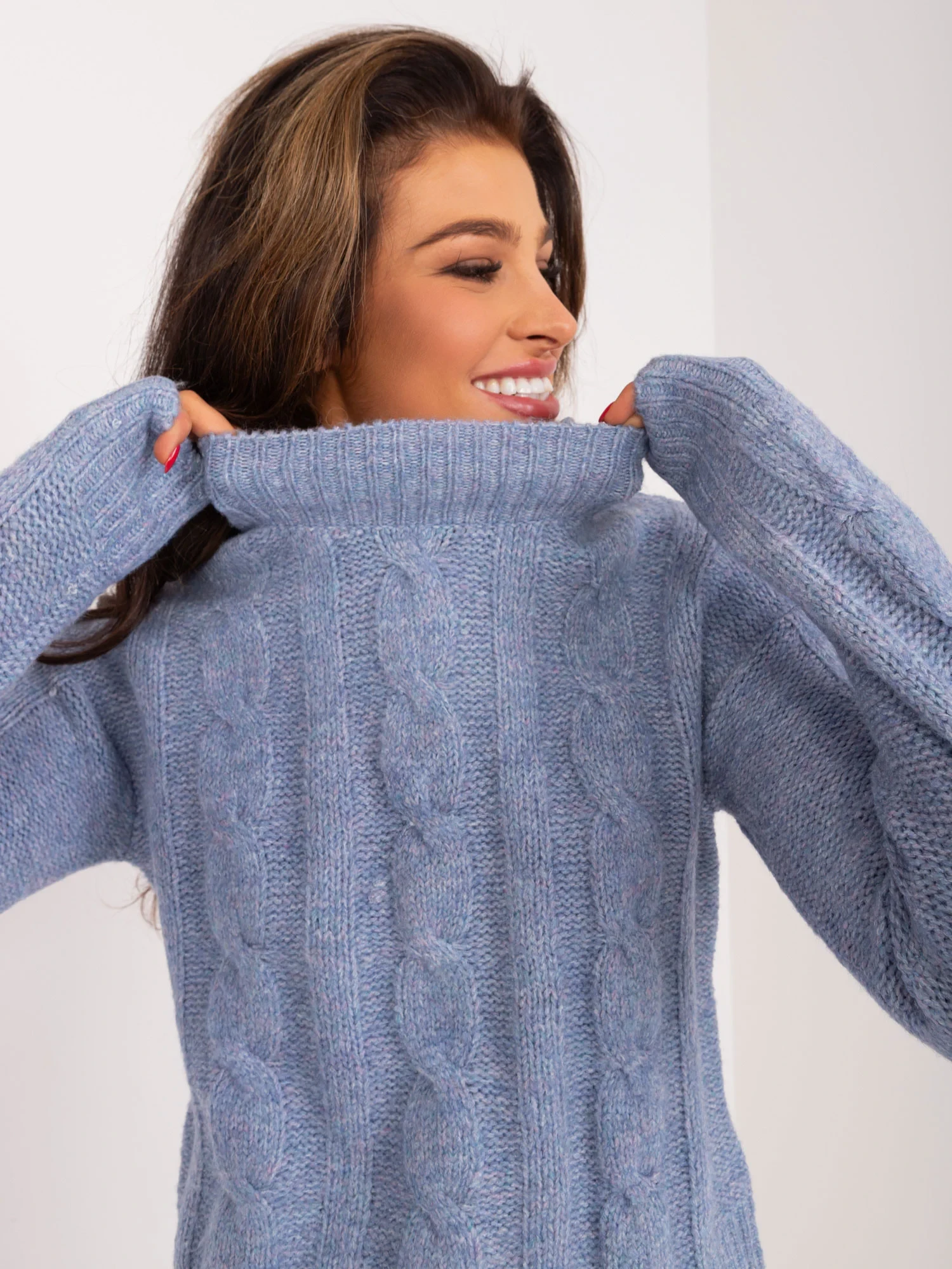 Wymiary swetra w rozmiarze S mierzone na płasko: szerokość pod pachami - 44 cm, długość rękawa - 63 cm, długość całkowita - 48 cm.