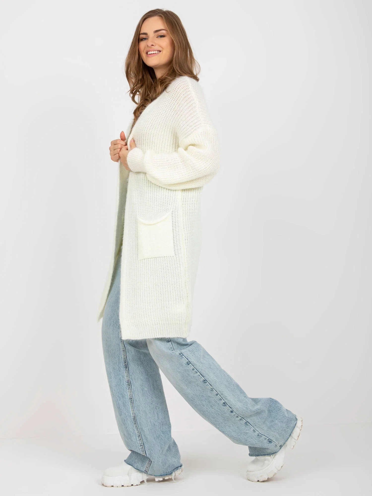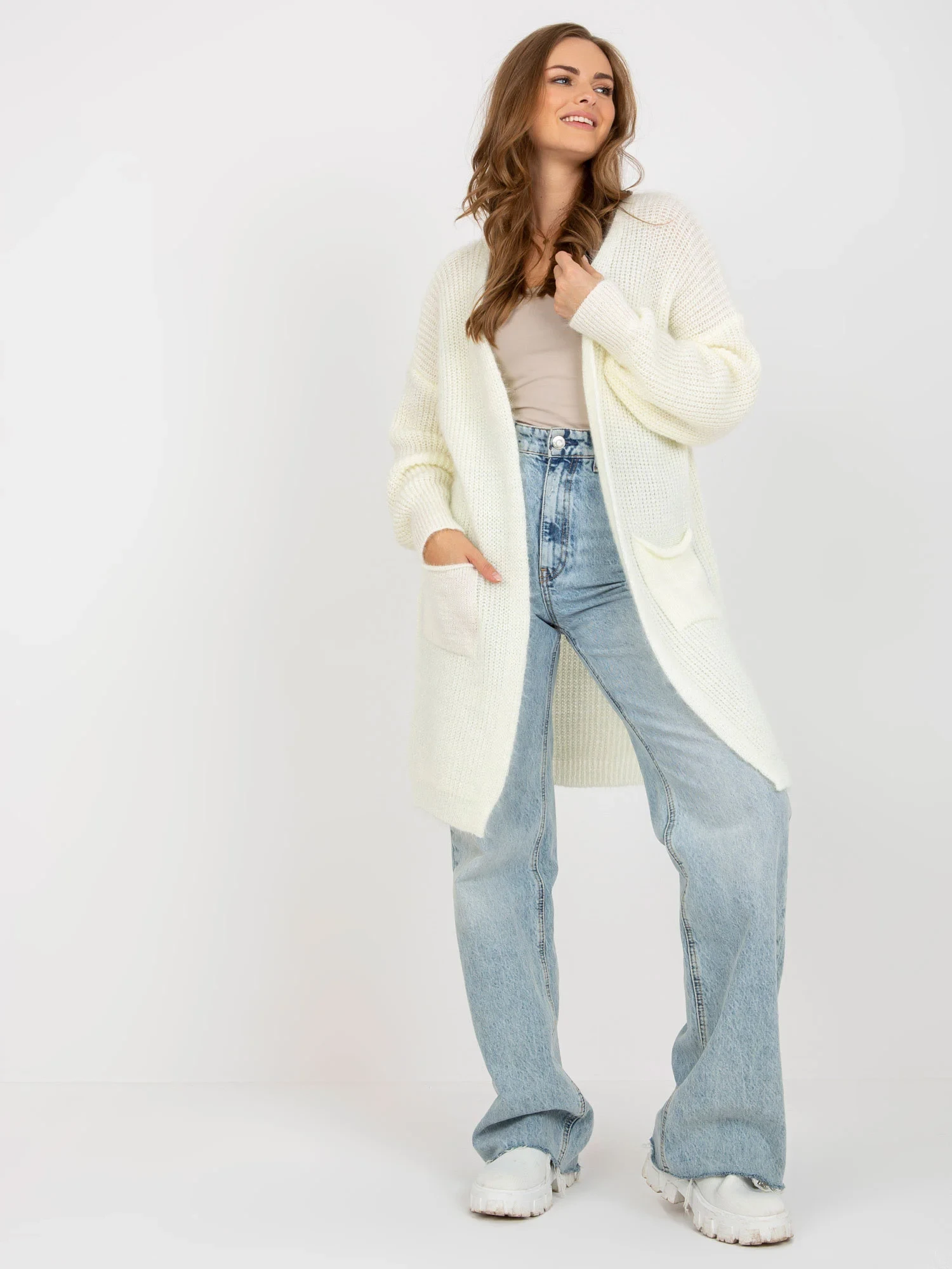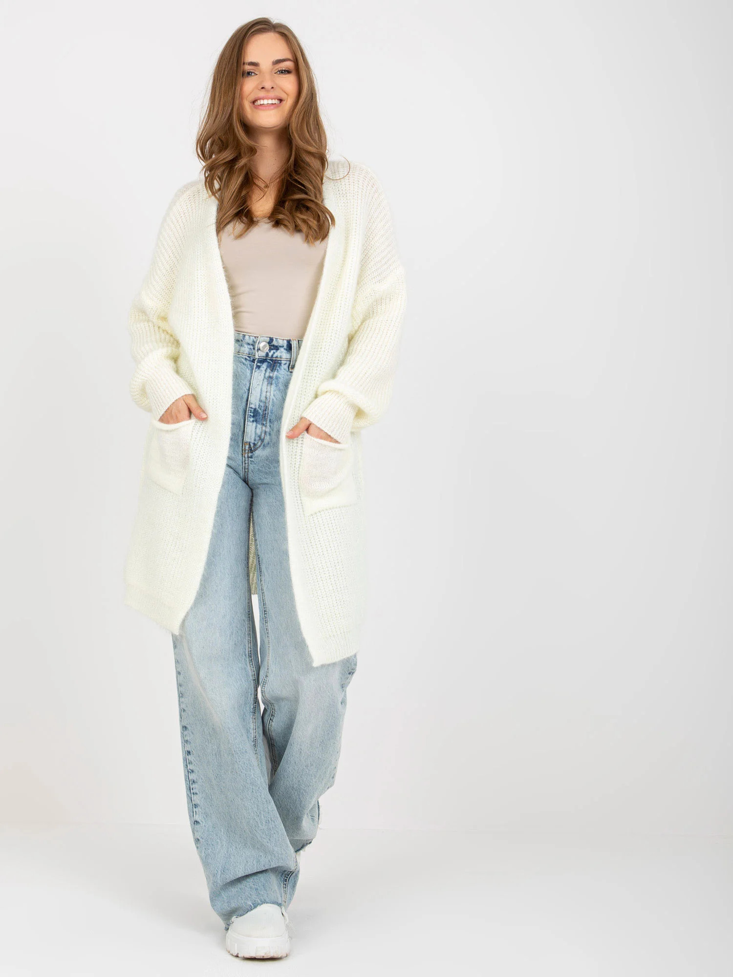 Ecru fluffy kardigan z kieszeniami OCH BELLA .