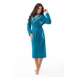 Elegantní dámský župan z bavlněného úpletu. šálový límec s dlouhými rukávy, zavazování v pase. kapsy na úrovni boků.