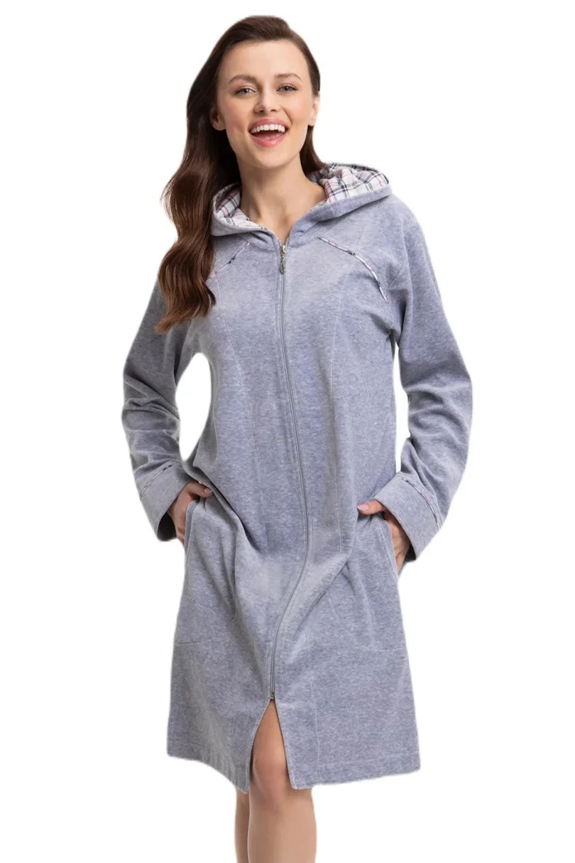 <p class="" data-start="25" data-end="329">Szlafrok damski 389 LUNA to kwintesencja komfortu i elegancji. Wykonany z wysokiej jakości weluru, otula ciało miękkością i zapewnia ciepło niezależnie od pory roku. Granatowy kolor indygo oraz wariant szary nadają mu stylowego wyglądu, a luźny krój sprawia, że doskonale układa się na każdej sylwetce.</p> <p class="" data-start="331" data-end="620">Model został wyposażony w praktyczny kaptur, który doskonale sprawdzi się po kąpieli, chroniąc wilgotne włosy przed chłodem. Funkcjonalne kieszenie pomieszczą klucze, telefon lub chusteczki, a eleganckie wykończenie karczku, kaptura i rękawów dzianiną w kratkę dodaje charakteru i klasy.</p> <p class="" data-start="622" data-end="865">Zapinany na wygodny ekspres, szlafrok zapewnia pełną swobodę ruchów, doskonale sprawdzając się zarówno w domowym zaciszu, jak i w spa, pensjonacie czy szpitalu. Długość do kolan i długie rękawy czynią go idealnym wyborem na chłodniejsze dni.</p> <p class="" data-start="622" data-end="865">Skład: 82% Bawełna, 18% Poliester</p> <p> </p>