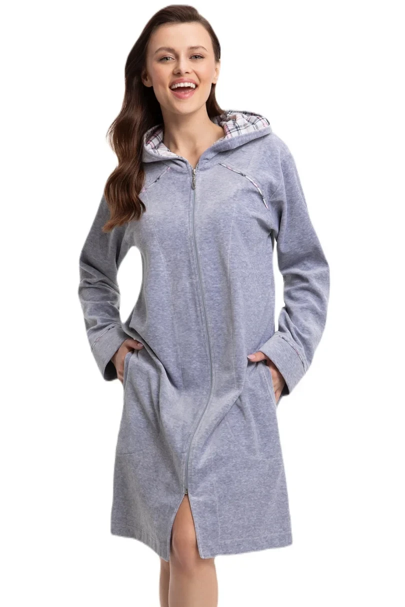 <p class="" data-start="25" data-end="329">Szlafrok damski 389 3xl LUNA to kwintesencja komfortu i elegancji. Wykonany z wysokiej jakości weluru, otula ciało miękkością i zapewnia ciepło niezależnie od pory roku. Granatowy kolor indygo oraz wariant szary nadają mu stylowego wyglądu, a luźny krój sprawia, że doskonale układa się na każdej sylwetce.</p> <p class="" data-start="331" data-end="620">Model został wyposażony w praktyczny kaptur, który doskonale sprawdzi się po kąpieli, chroniąc wilgotne włosy przed chłodem. Funkcjonalne kieszenie pomieszczą klucze, telefon lub chusteczki, a eleganckie wykończenie karczku, kaptura i rękawów dzianiną w kratkę dodaje charakteru i klasy.</p> <p class="" data-start="622" data-end="865">Zapinany na wygodny ekspres, szlafrok zapewnia pełną swobodę ruchów, doskonale sprawdzając się zarówno w domowym zaciszu, jak i w spa, pensjonacie czy szpitalu. Długość do kolan i długie rękawy czynią go idealnym wyborem na chłodniejsze dni.</p> <p class="" data-start="622" data-end="865">Skład: 82% Bawełna, 18% Poliester</p> <p class="" data-start="622" data-end="865"> </p>