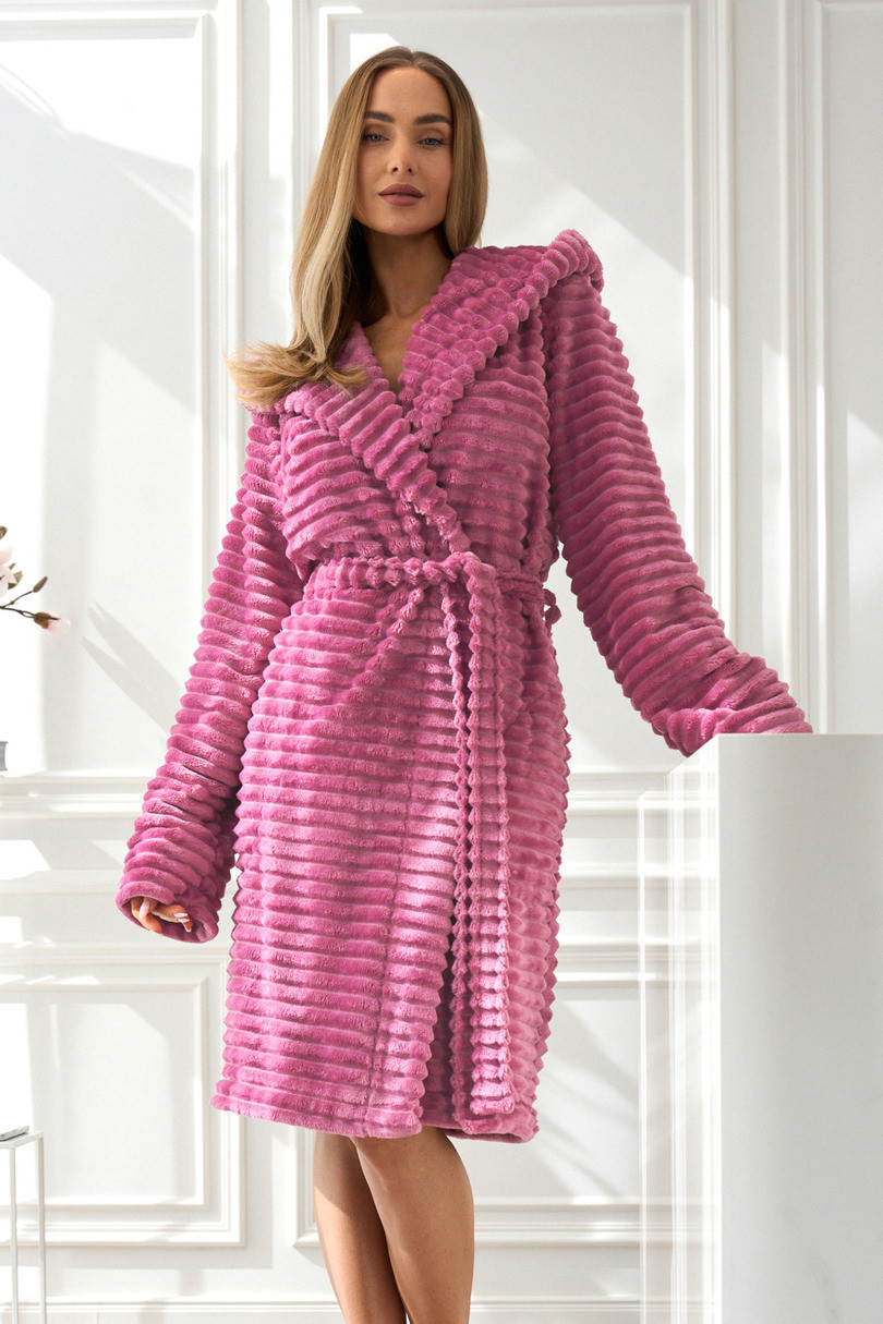 Dámský krátký župan s kapucí ze super měkkého úpletu. Zavazování v pase, na úrovni boků kapsy.