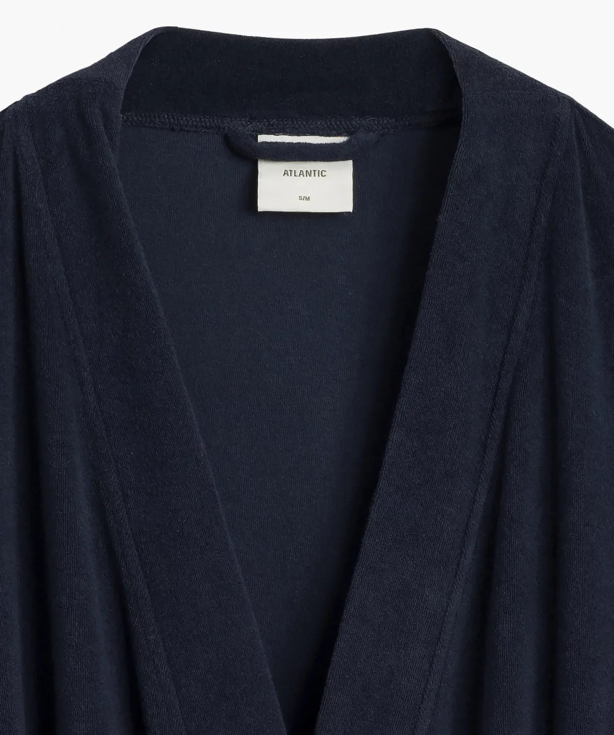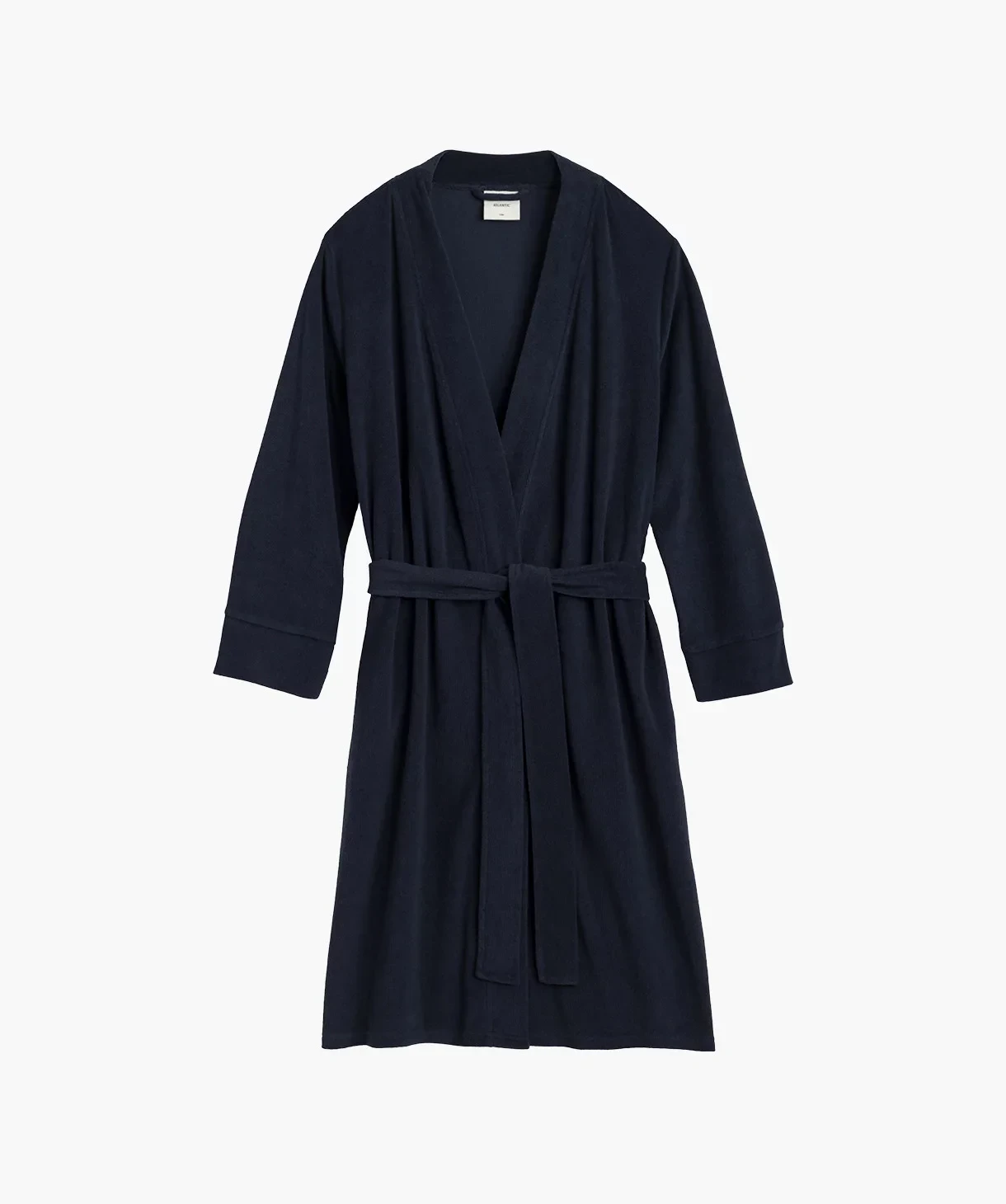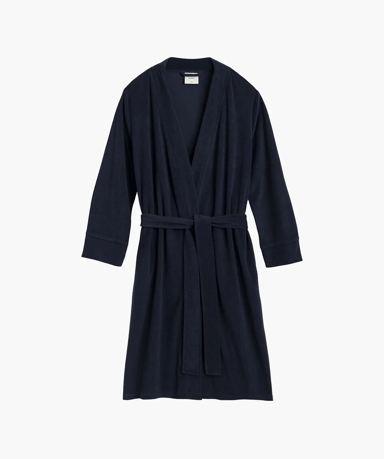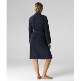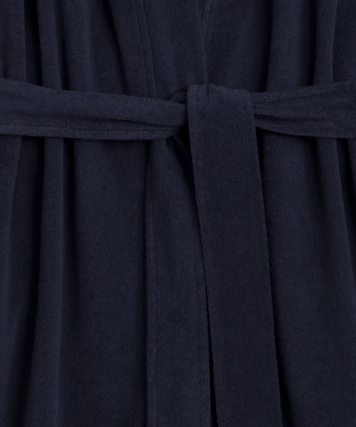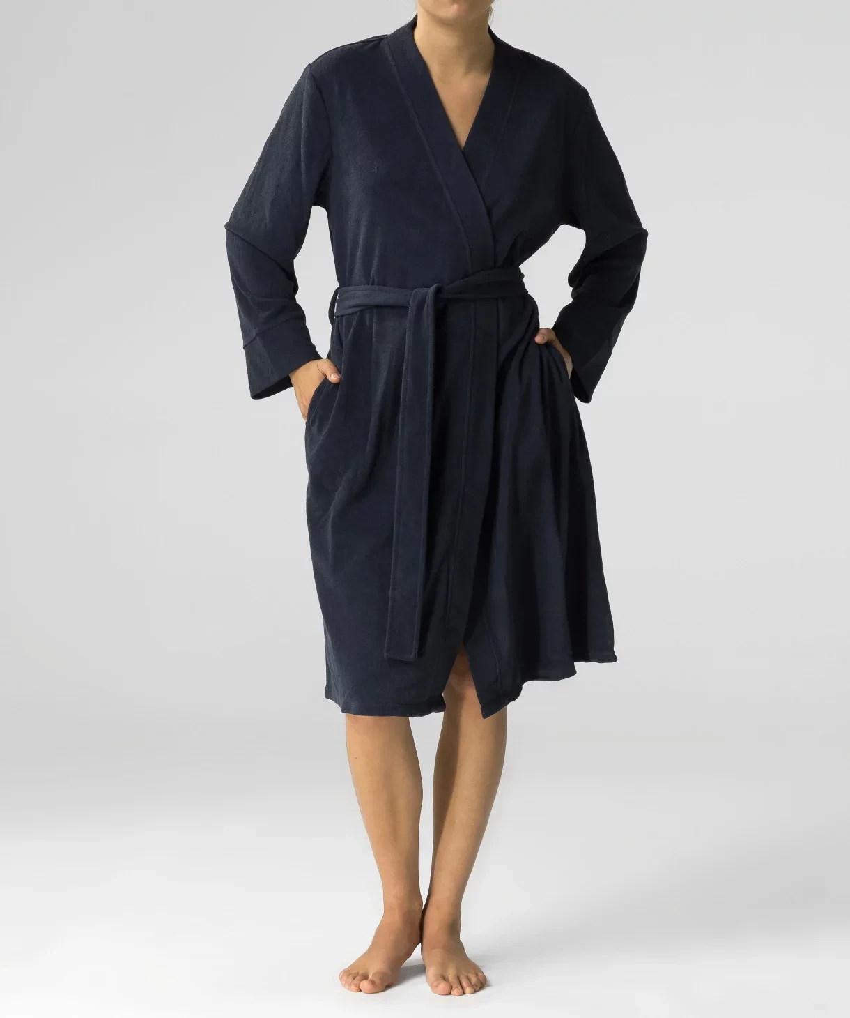 Szlafrok damski w głębokim odcieniu granatowego ma ponadczasowy, kimonowy krój. Szlafrok długości do kolan ma długie i szerokie rękawy, praktyczne kieszenie po bokach oraz wiązanie na wygodny pasek w talii.