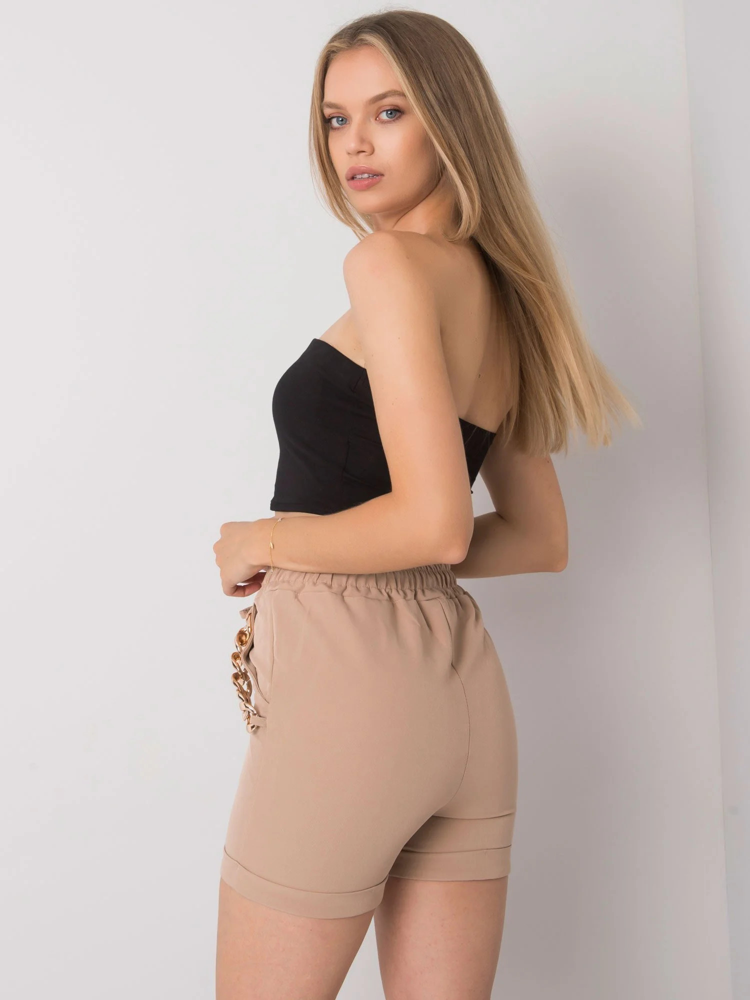 Beżowe szorty z ozdobnymi łańcuszkami.