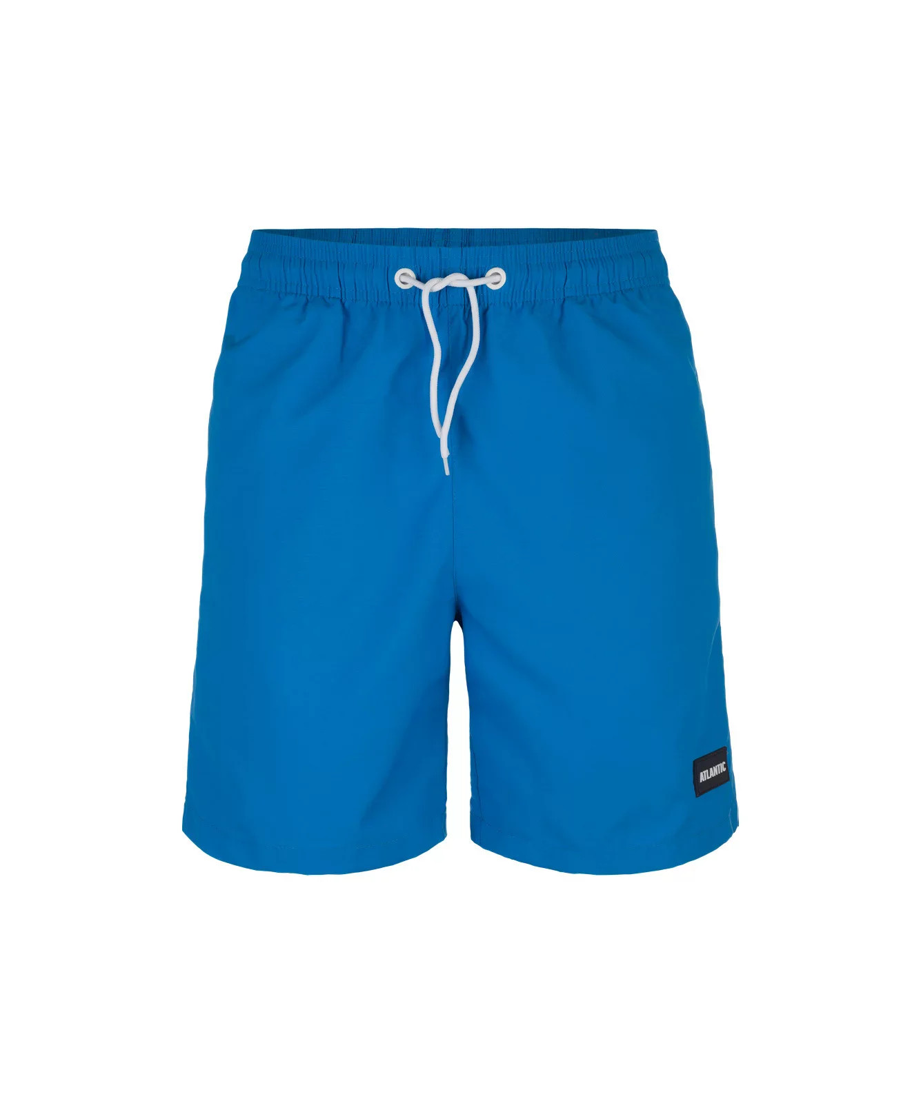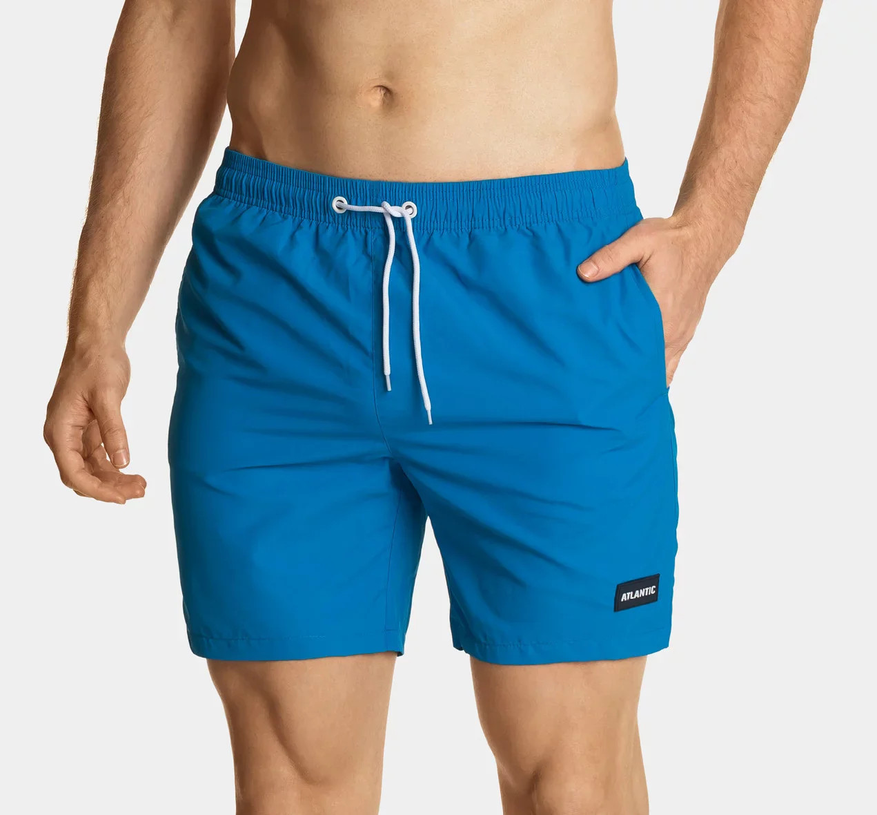 Szorty plażowe w kolorze ciemno-turkusowym, mają standardowej długości nogawki oraz średniej wysokości stan. W pasie szorty wiązane są na sznurek. Na lewej nogawce umieszczone jest niewielkich rozmiarów logo Atlantic, a po bokach szortów znajdują się wygodne i praktyczne kieszenie. Szorty wykonane są z wysokiej jakości nylonu, którego główne cechy to: sztywność w dotyku (tzw. paper touch), nierozciągliwość i nieodkształcanie się. Materiał jest poza tym odporny na działanie promieni słonecznych. Wewnątrz znajduje się siateczkowa podszewka wykonana z poliestru.