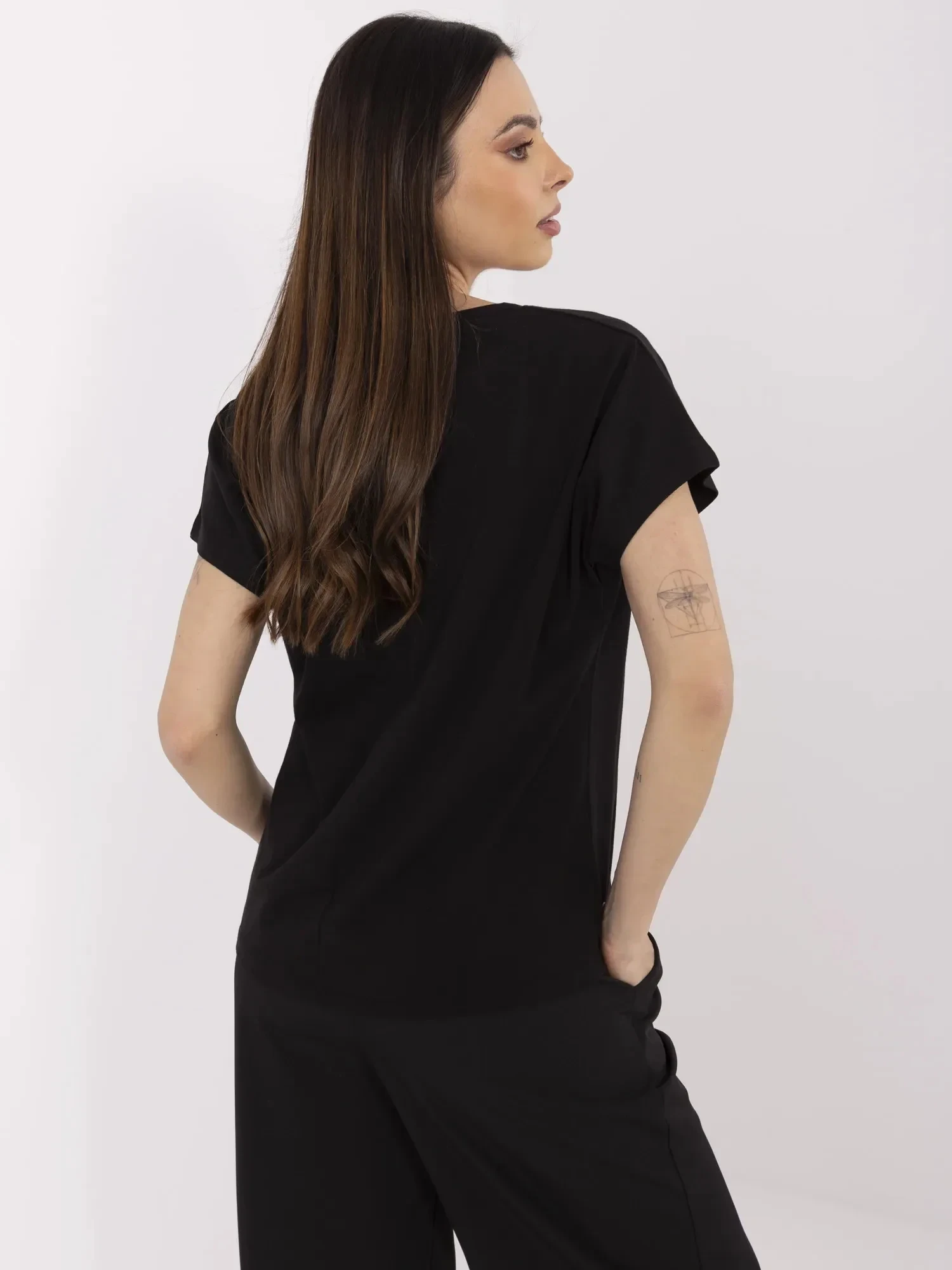 Wymiary t-shirtu w rozmiarze S mierzone na płasko: szerokość pod pachami - 52 cm, długość rękawa - 23 cm (od szwu), długość całkowita - 62 cm, szerokość w biodrach - 51 cm.
