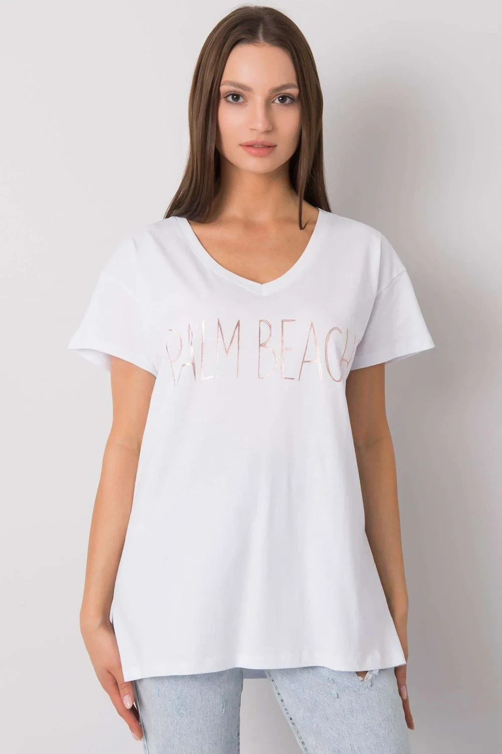 Dámské tričko s krátkým rukávem a výstřihem do V. Ozdobný nápis na přední straně.