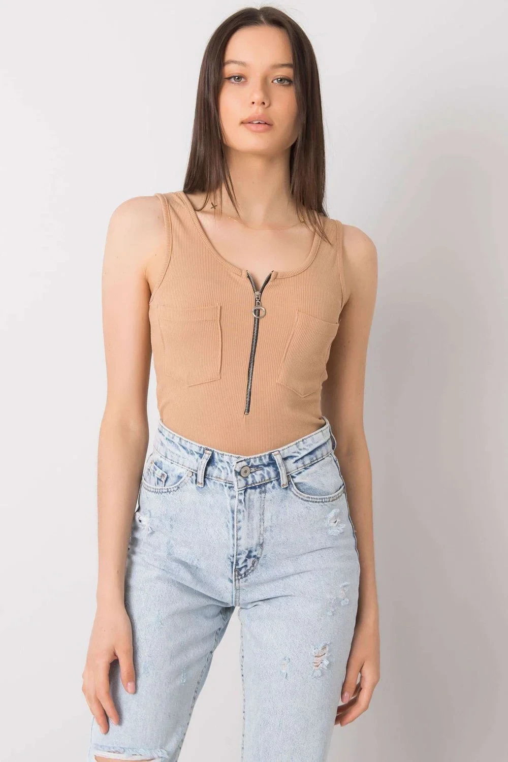 Tričko s kulatým výstřihem, ramínka. Zapínání na zip vpředu a ozdobné kapsy. Ideální na léto.