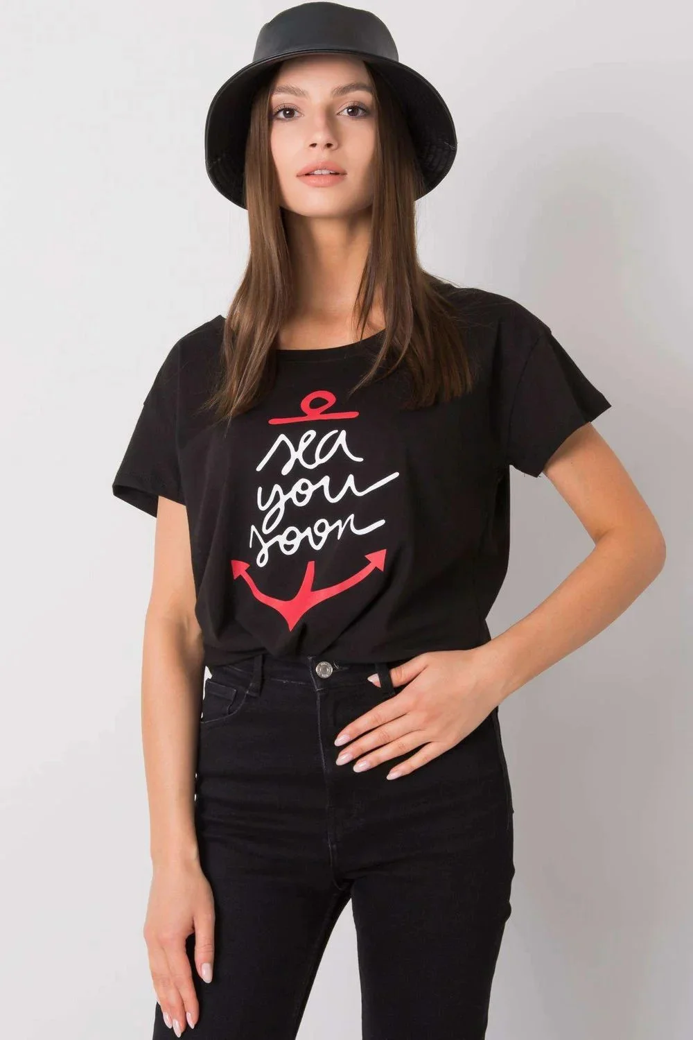 Dámské tričko s krátkými rukávy a kulatým výstřihem, ozdobný potisk na přední straně.