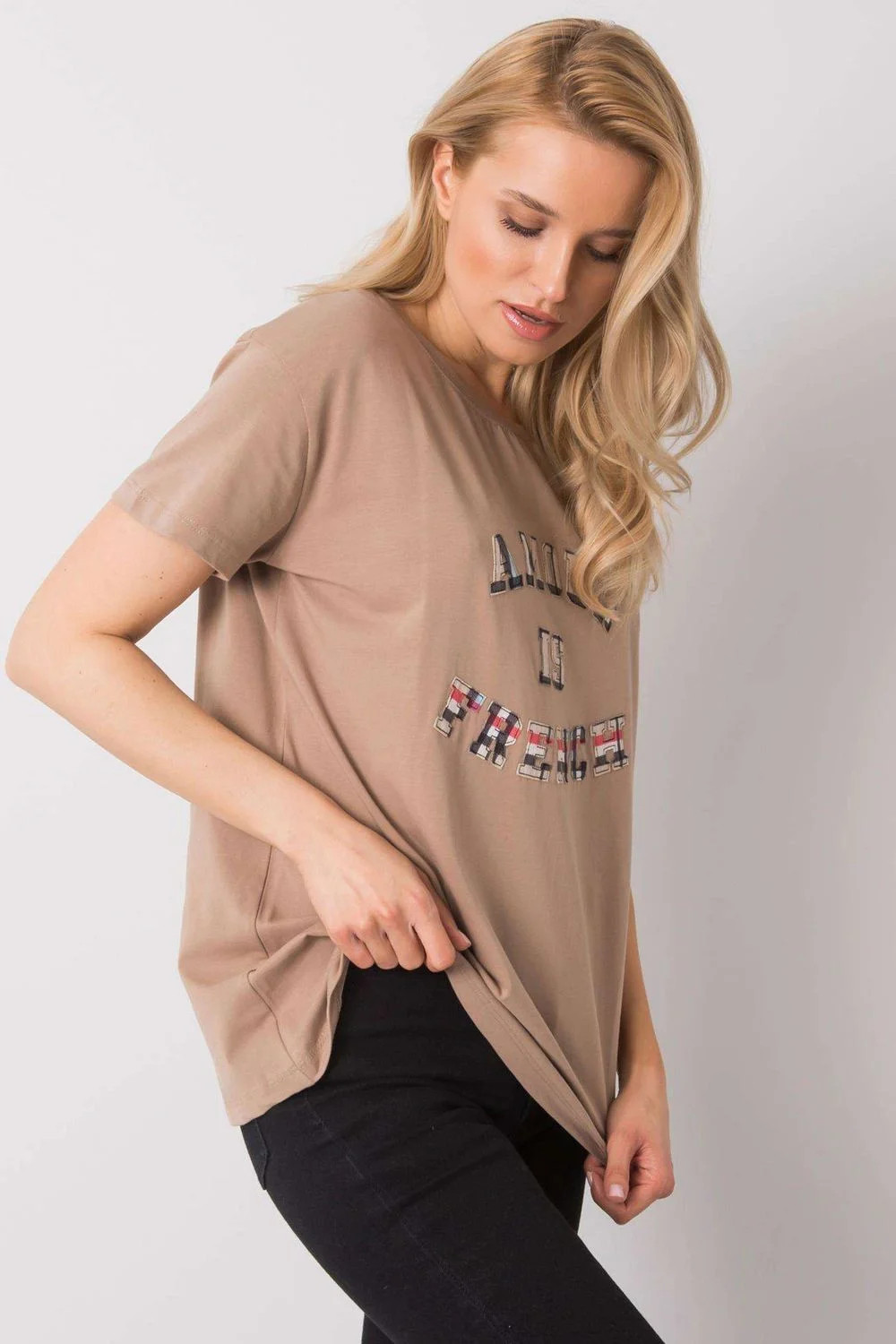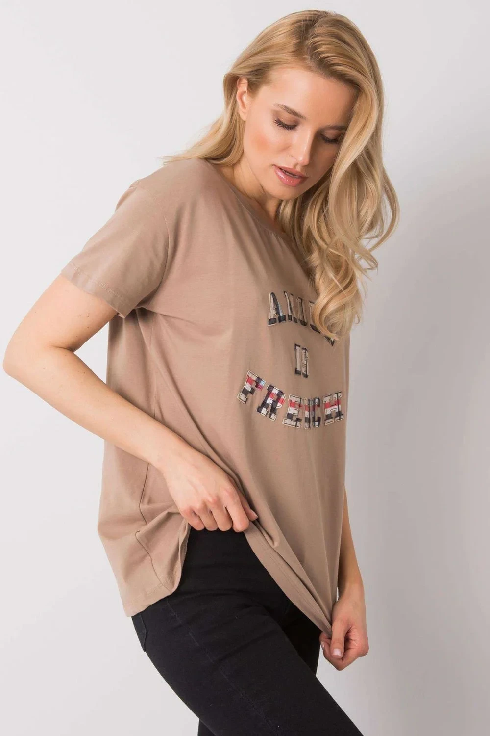 Dámské tričko volnějšího střihu s krátkými rukávy a kulatým výstřihem. Ozdobný nápis na přední straně.