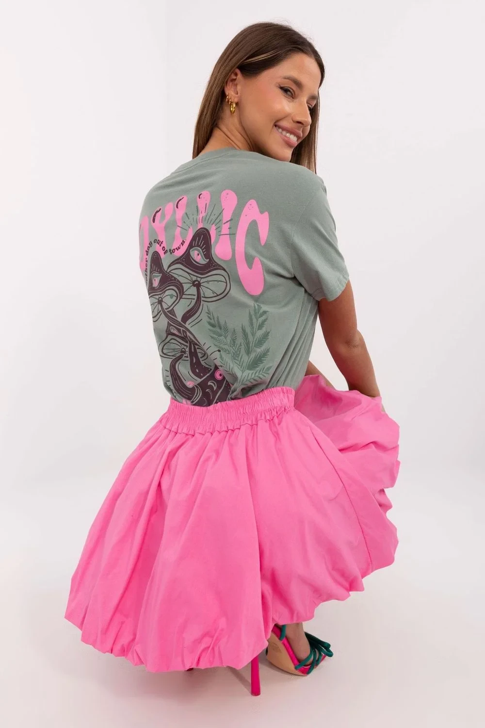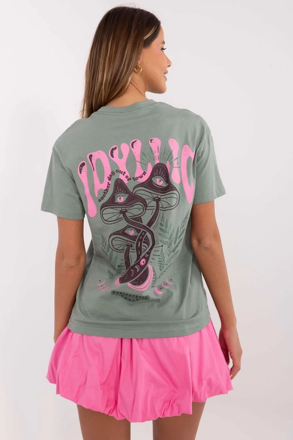 Dámské tričko klasického střihu, vyrobené z vysoce kvalitní bavlny, která zajišťuje pohodlné nošení. Přední část zdobí decentní potisk s nápisem, který tričku dodává módní, minimalistický charakter. Zadní část je ozdobena potiskem spojeným s dynamickými nápisy, které celku dodávají originální výraz. Model standardní délky s krátkými rukávy a kulatým výstřihem se skvěle hodí do každodenních stylizací. Ideální volba pro ženy, které ocení pohodlí a styl v jednom.