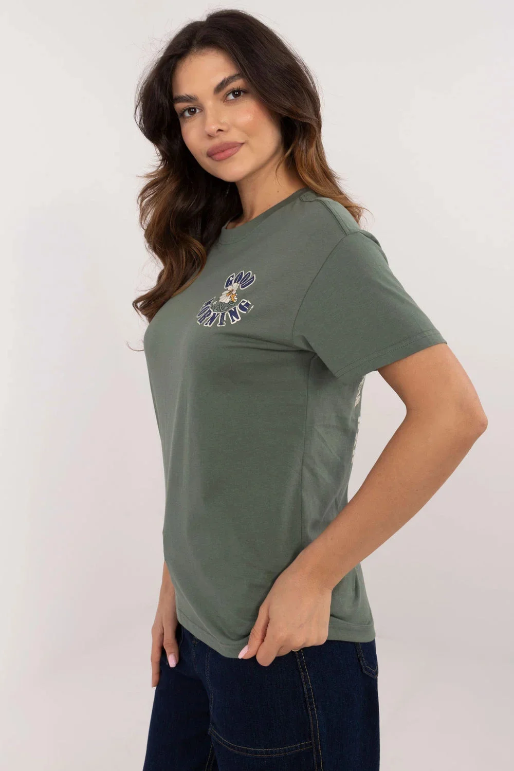 Dámské tričko klasického střihu, vyrobené z kvalitní bavlny, která zajistí pohodlné nošení. Přední část zdobí decentní potisk s nápisem, který tričku dodává módní a minimalistický charakter. Zadní část je ozdobena potiskem spojeným s dynamickými nápisy, které celku dodávají originální výraz. Model má standardní délku, krátké rukávy a kulatý výstřih, skvěle se hodí do každodenních outfitů. Ideální volba pro ženy, které ocení pohodlí a styl v jednom.